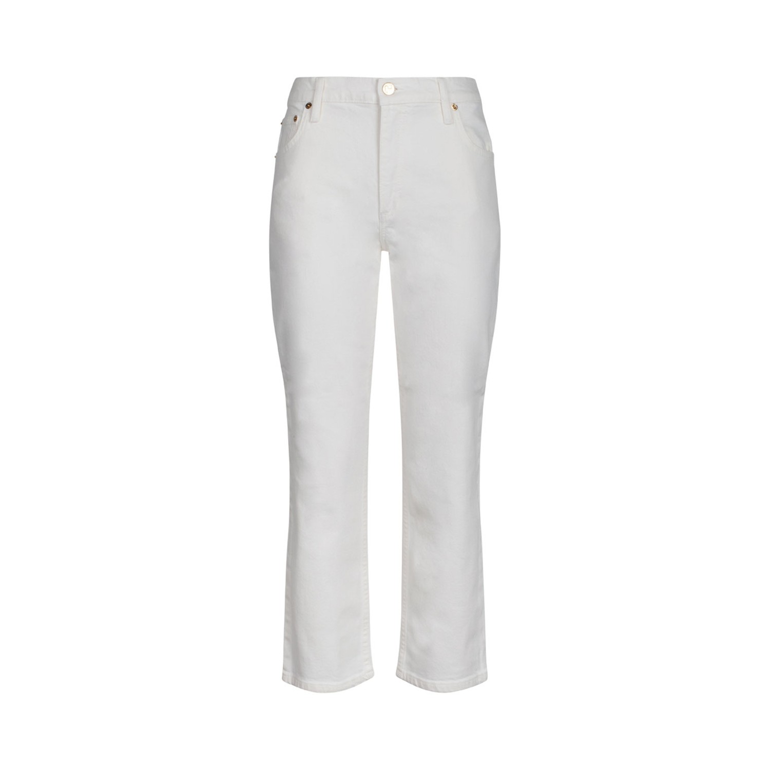 Tory Burch White Flare Denim Jeans. White cotton blend denim jeans, stretch design, mid rise. Belt loops, front button and zip fastening, classic five pockets, flared hem.