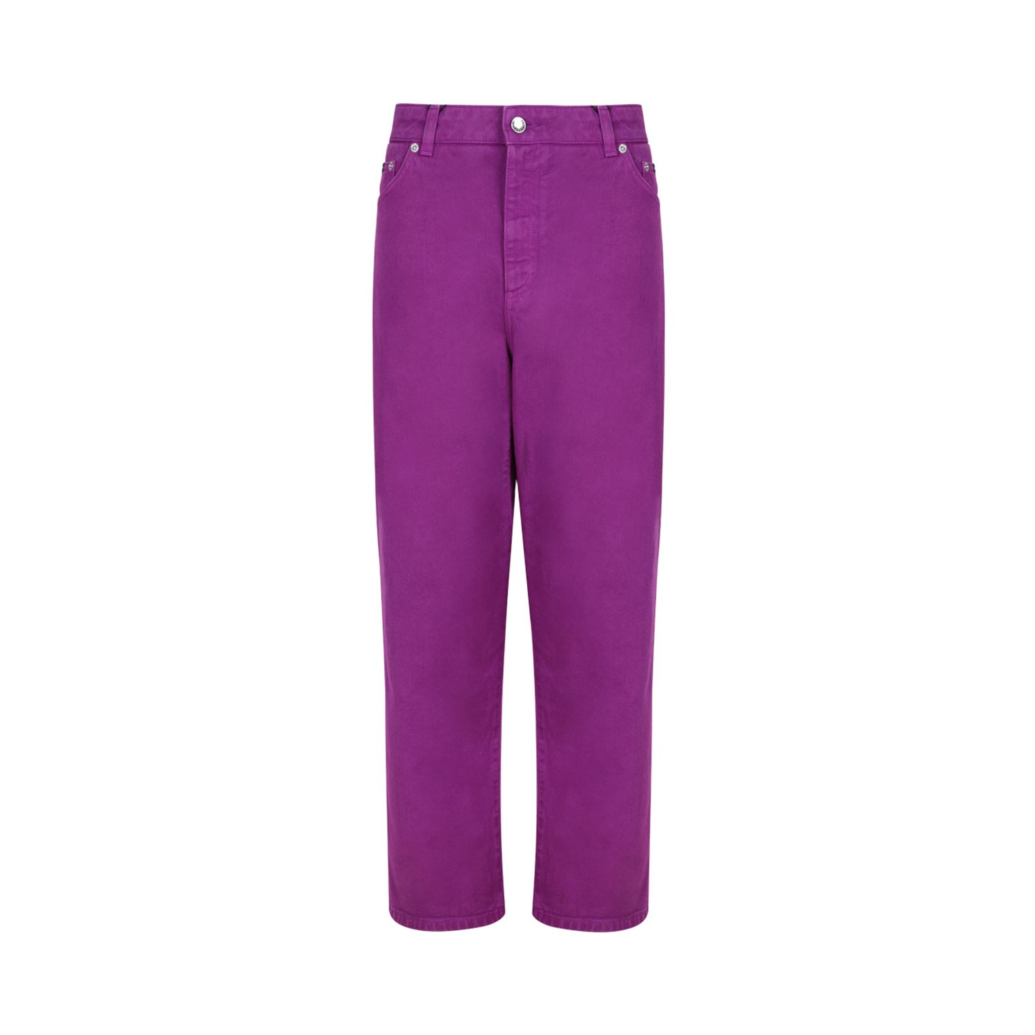 Dolce & Gabbana Purple Denim Jeans. Bright purple high-waisted jeans in structured denim cotton with classic five-pocket design. Straight leg cut with silver-tone rivets and button closure. Rear patch pockets and belt loops.