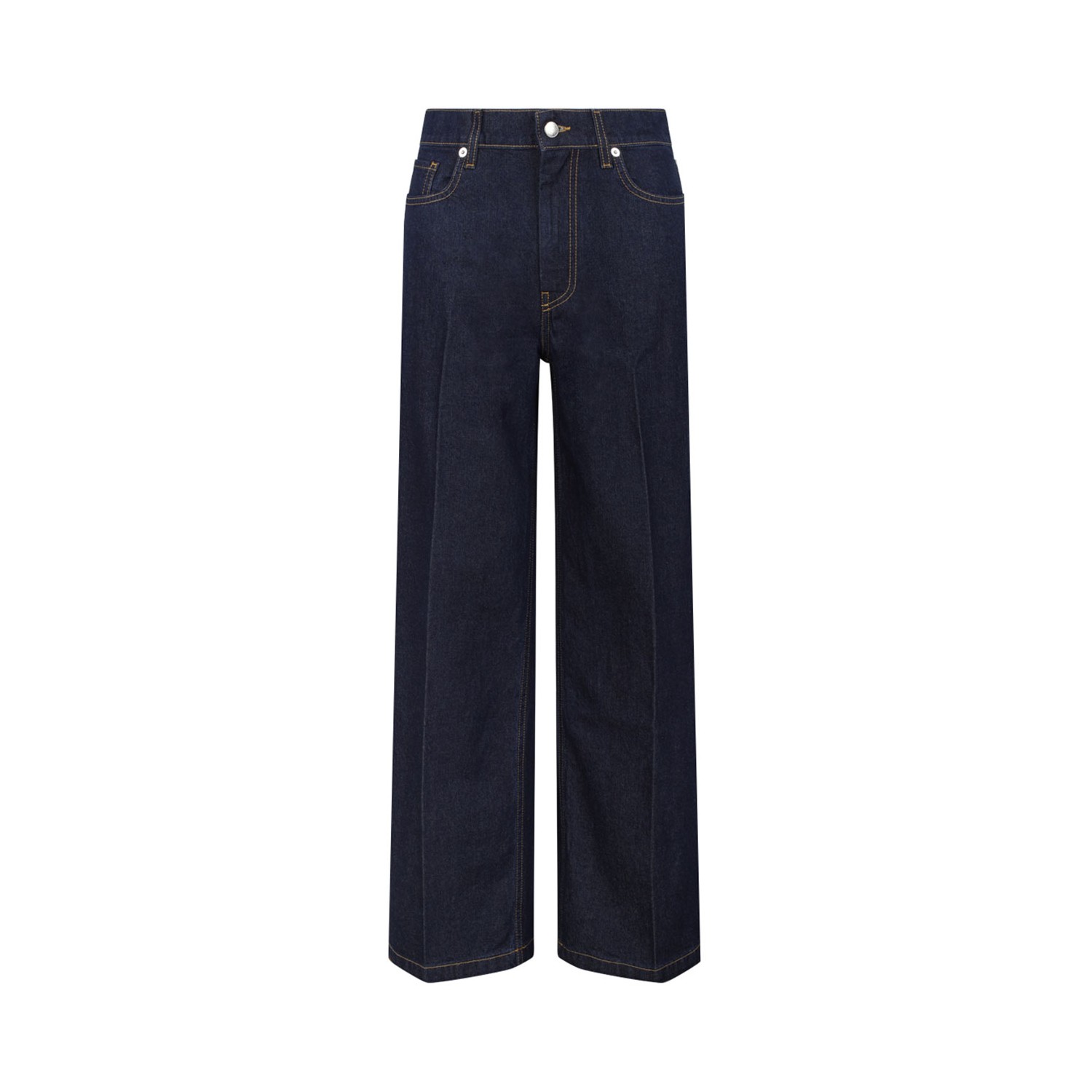 Maison Kitsune Dark Blue High Waisted Wide Leg Jeans. Light blue high waisted jeans with wide leg, button fly, five pockets and contrast topstitching.
