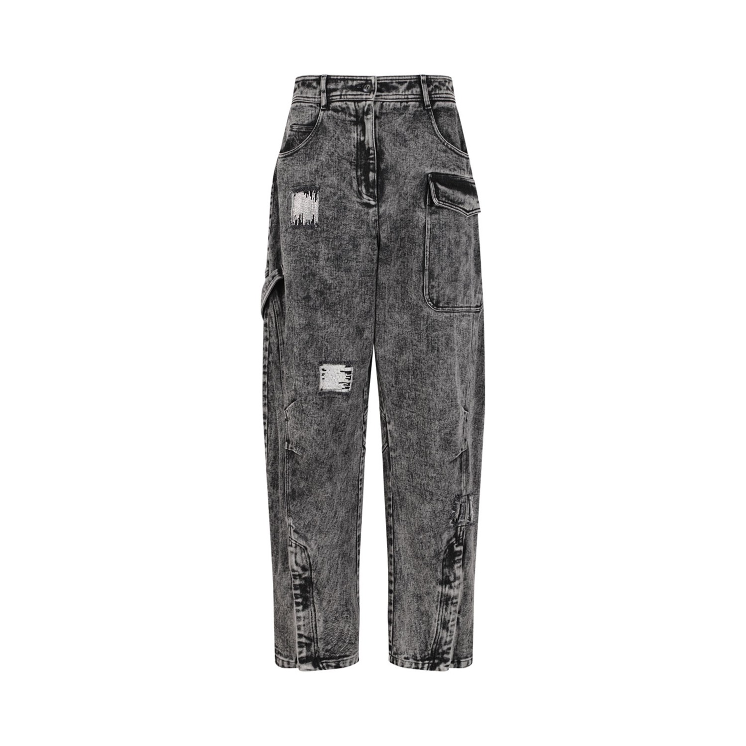 Hui Milano Dark Grey Denim Jeans. Long jeans in dark grey, featuring a design with ripped details and contrasting applications, embellished with multiple pockets.