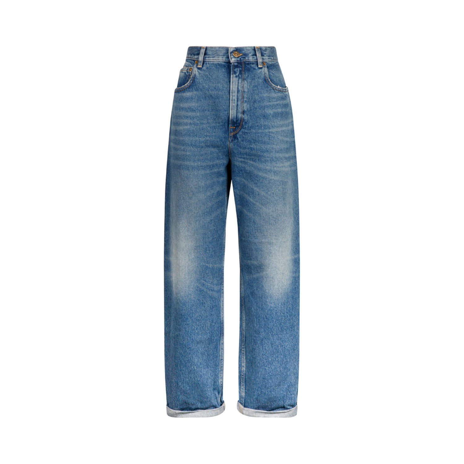 Golden Goose Blue Medium Wash Jeans. Blue cotton jeans, double gold star on the back, five pockets.