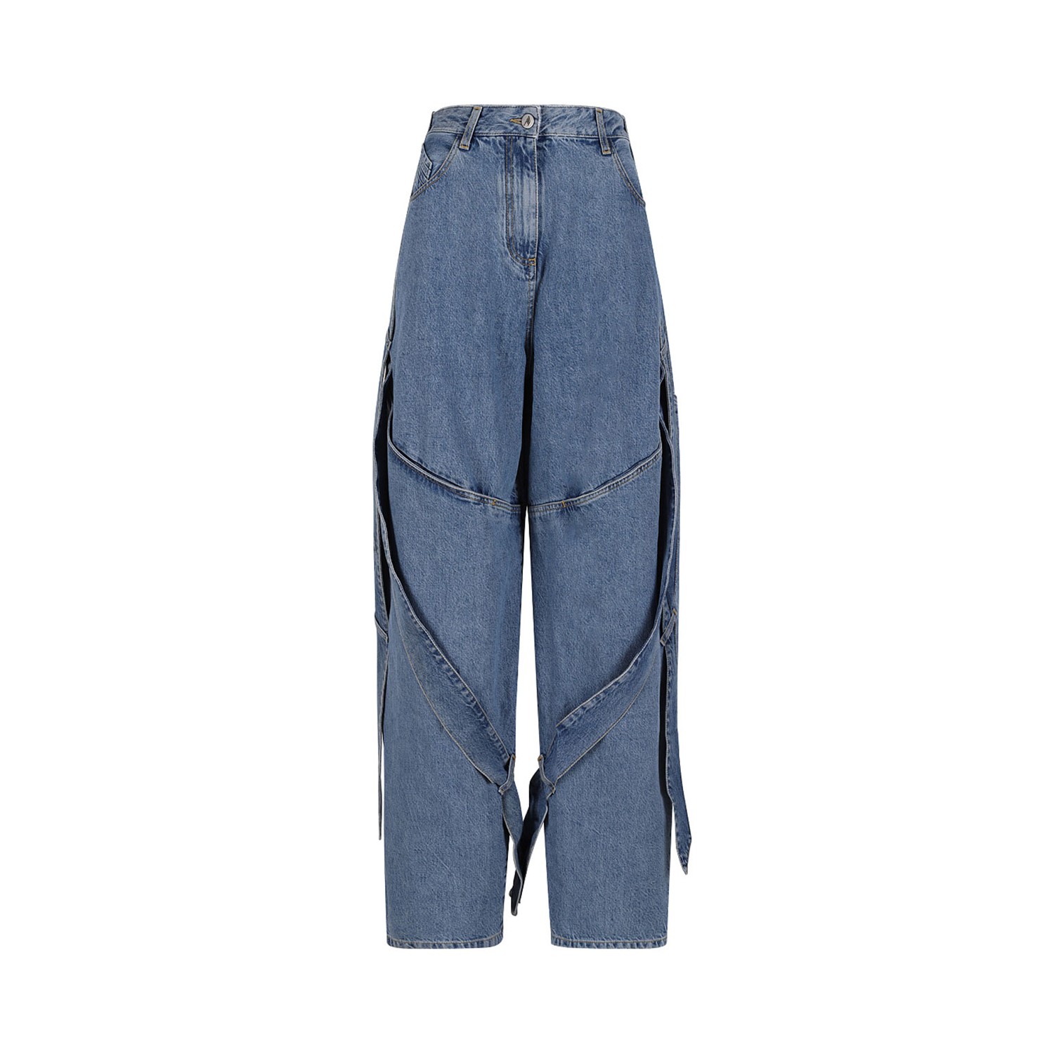 The Attico Sky Blue Long Trousers. Long trousers in sky blue washed denim with detail with knot, insert design, stitching detail, five pockets, passers-by.