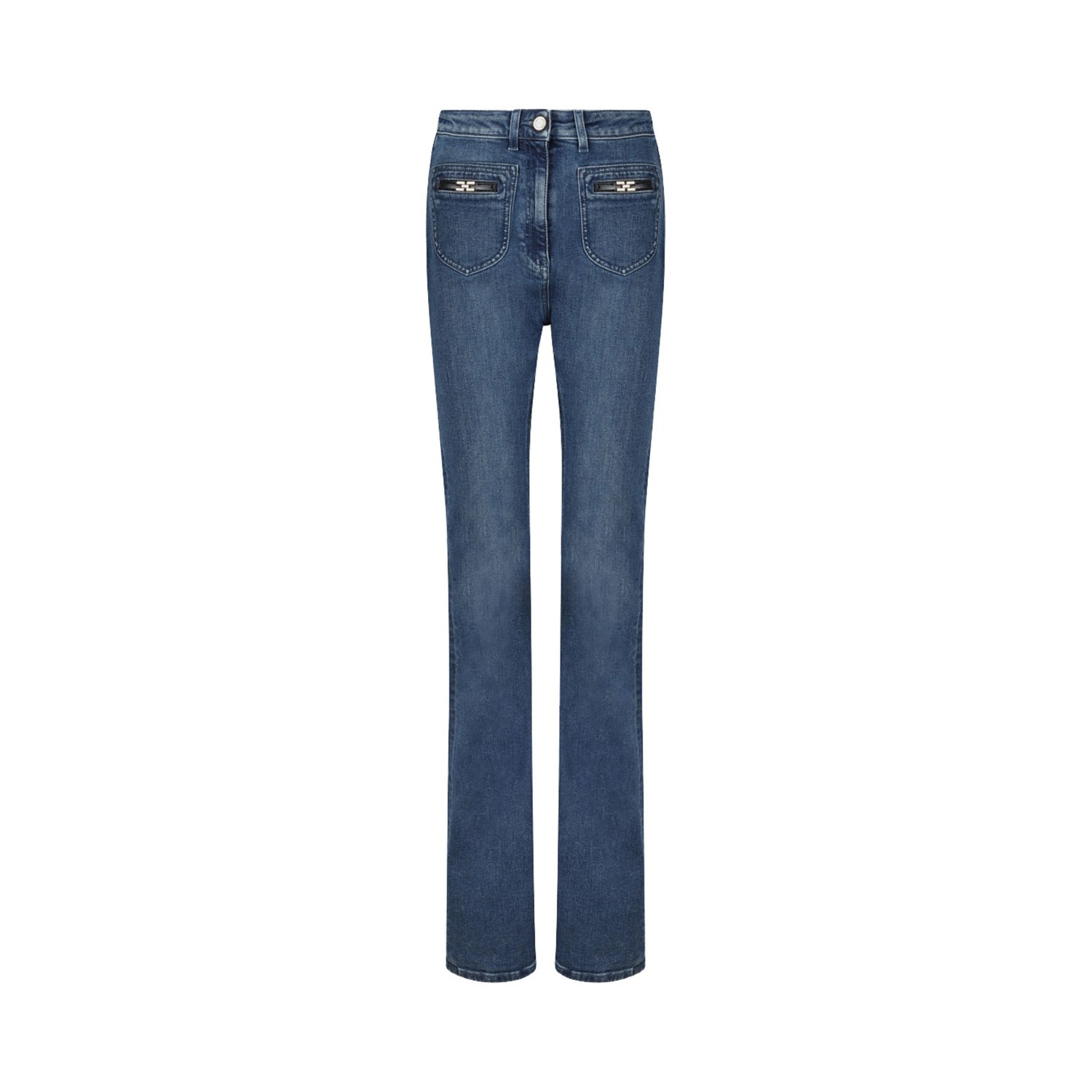 Elisabetta Franchi Blue Flared Jeans. Blue cotton blend flared jeans with high waist, belt loops and welt pockets.