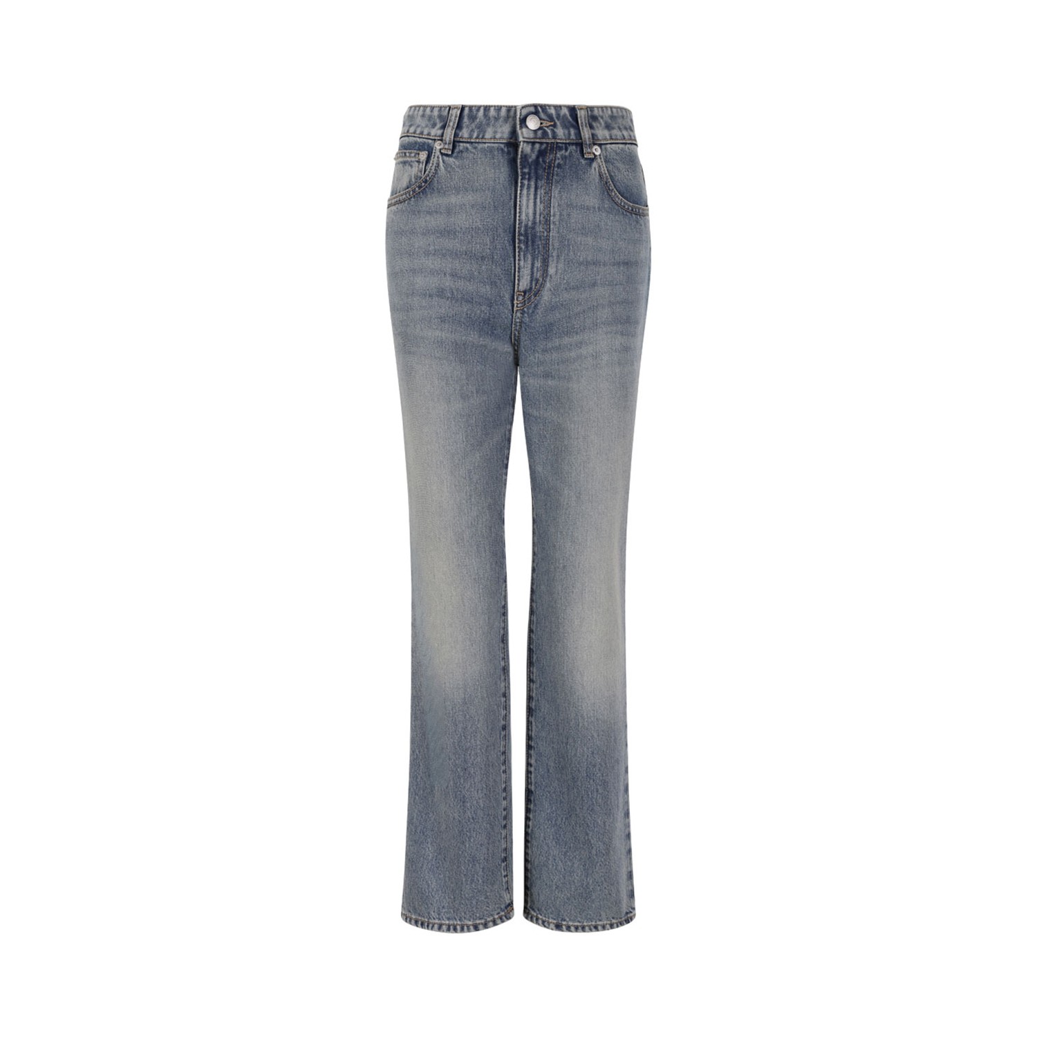 Alexander McQueen Light Blue Denim Straight-Leg Jeans. Light blue denim straight-leg jeans with five pocket design, front button and zip closure.