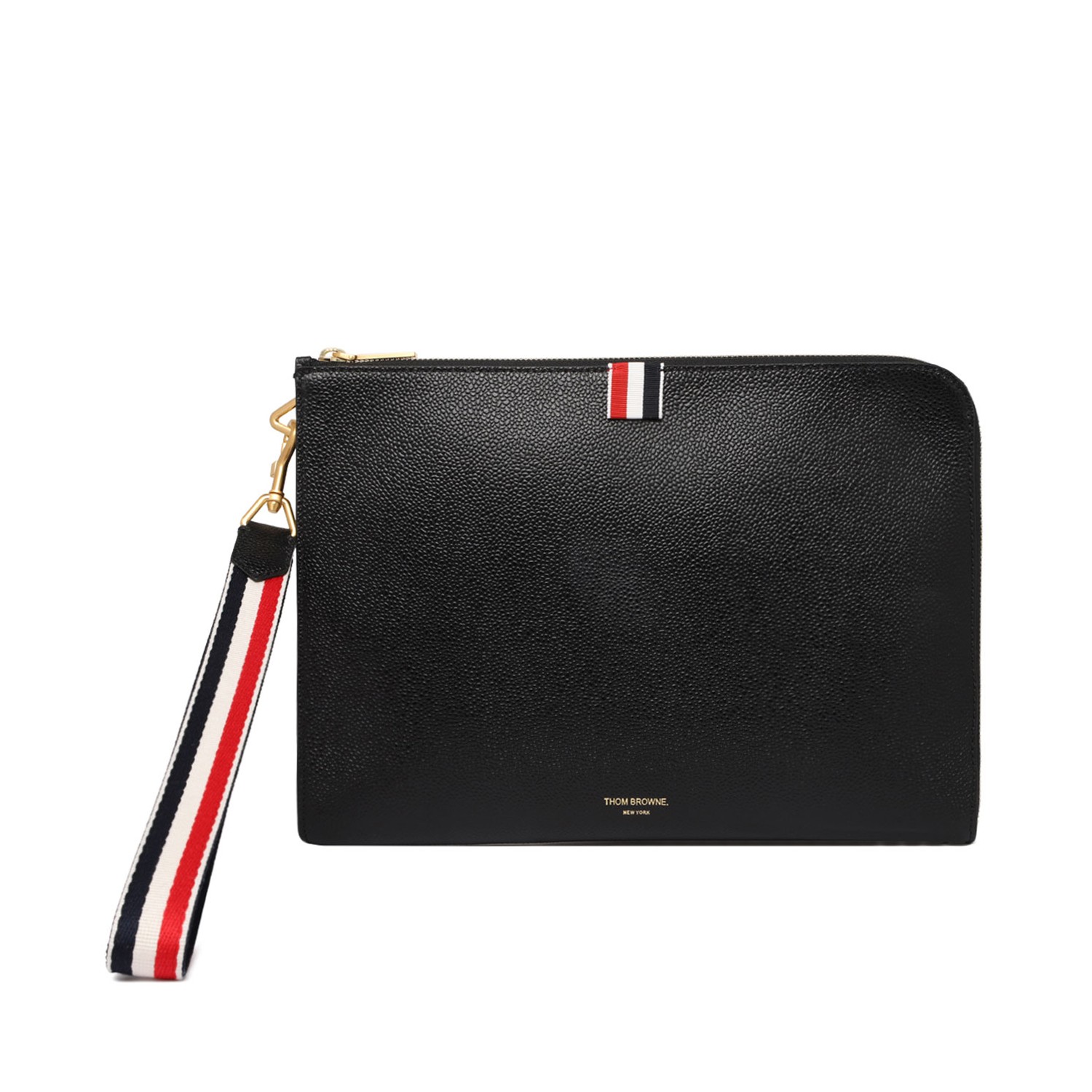 Thom Browne Black Document Case. Black leather document case with zip closure, logo print on the front, hook with distinctive colors of the brand.