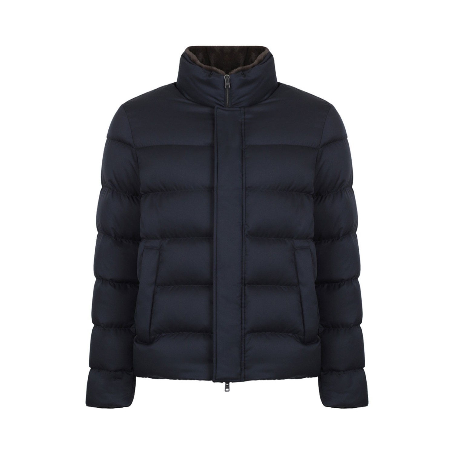 Herno Navy Blue Quilted Puffer Jacket. Navy blue quilted puffer jacket with padded designquilted, detachable faux-fur panel at neck, funnel neck. Concealed front press-stud fastening, concealed front zip fastening, long sleeves. Two side stud-fastening pockets, full lining, internal zip-fastening pockets, drawstring hem.