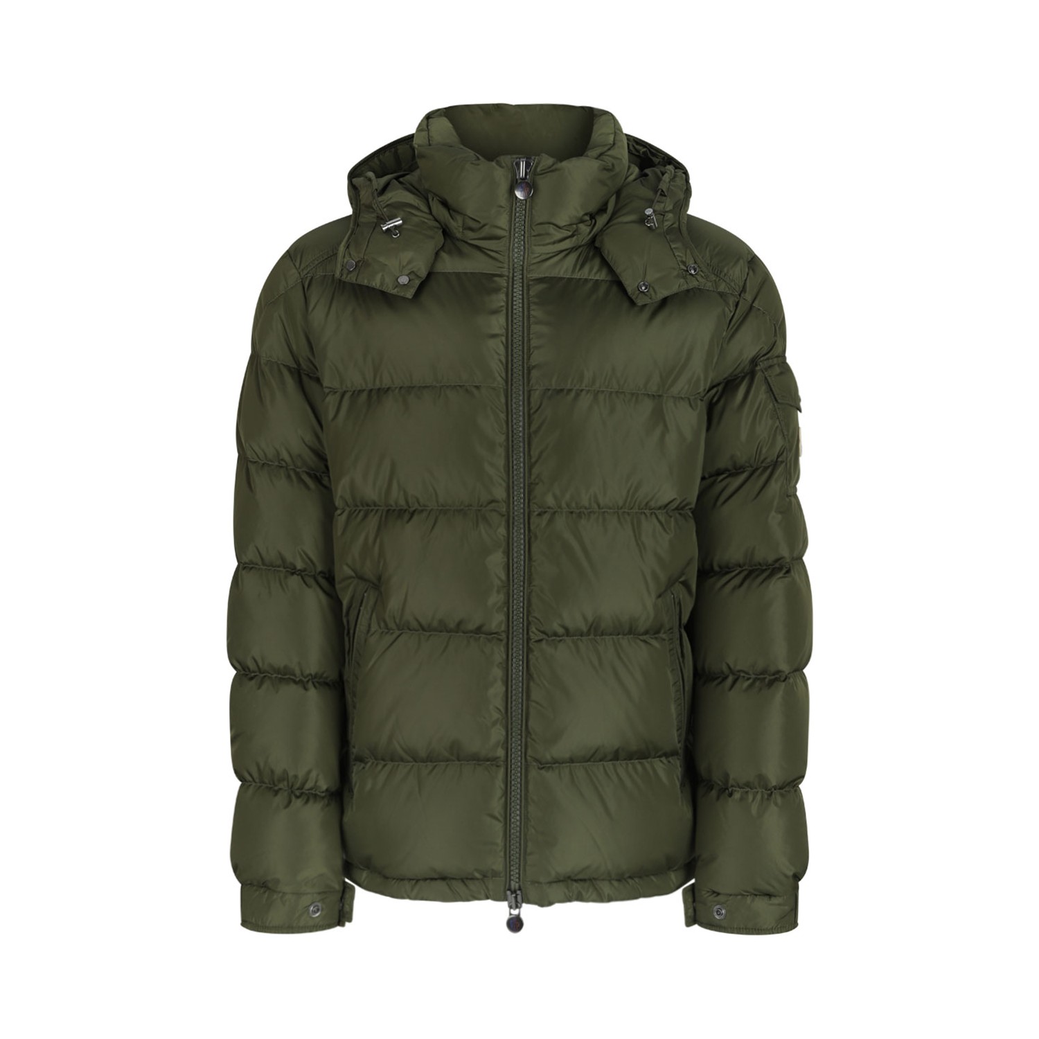 Moncler Dark Green Maya Down Jacket. Dark green down jacket with removable hood, long sleeves, front zip fastening. Pocket on the sleeve, logo patch applied on the sleeve, two zip pockets on the front. Cuffs with buttons, straight hem, technical fabric.