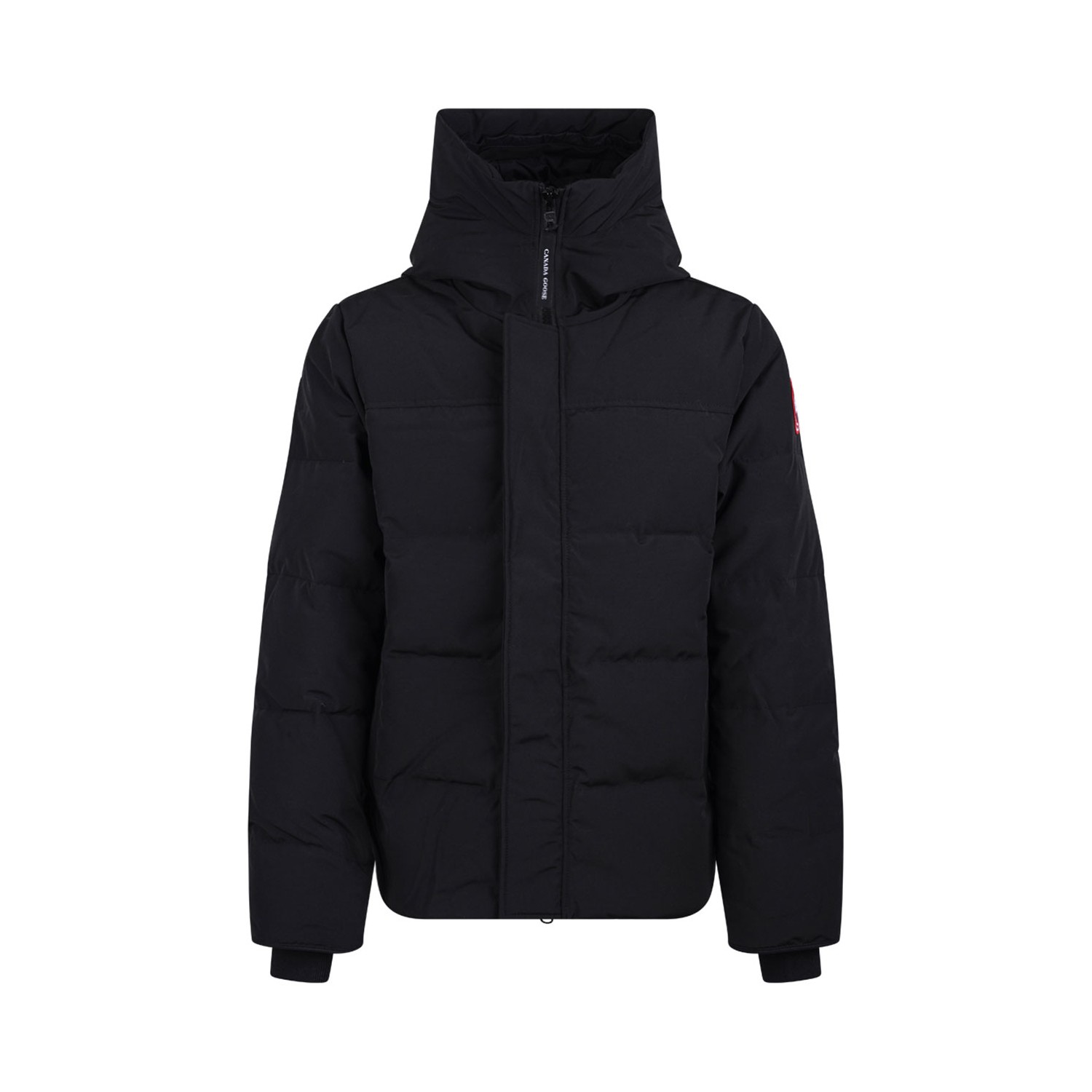 Canada Goose Black Langford Parka. Black cotton blend parka with padded design, logo patch at the sleeve, classic hood. Long sleeves and front zip fastening.