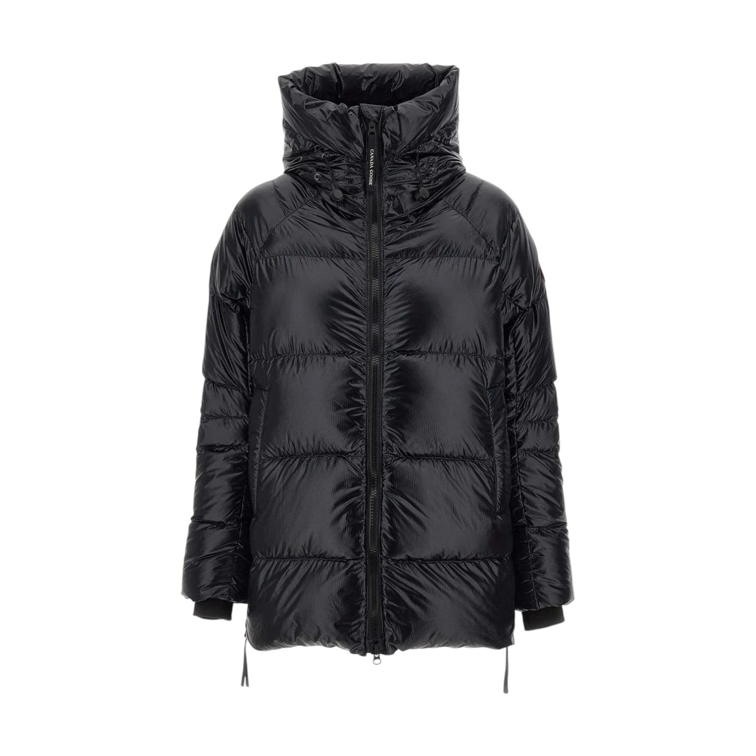 Canada Goose Black Cypress Down Jacket. Black down jacket in recycled Feather-Light-Ripstop fabric, ultralight, with water-repellent finish, padded, side zips for easy wear, hood with drawstring, front closure with logo zip, two side pockets, inset knit cuffs, iconic logo patch on the sleeve, internal pocket, internal backpack straps to carry the jacket on the shoulders, ideal garment for the cold season.