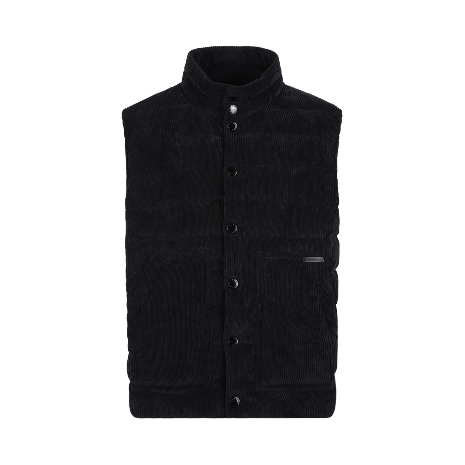 Dolce & Gabbana Black Corduroy Gilet. Black corduroy gilet with padded design, front press-stud fastening, high neck, sleeveless. Quilted, logo plaque, two side welt pockets and straight hem.