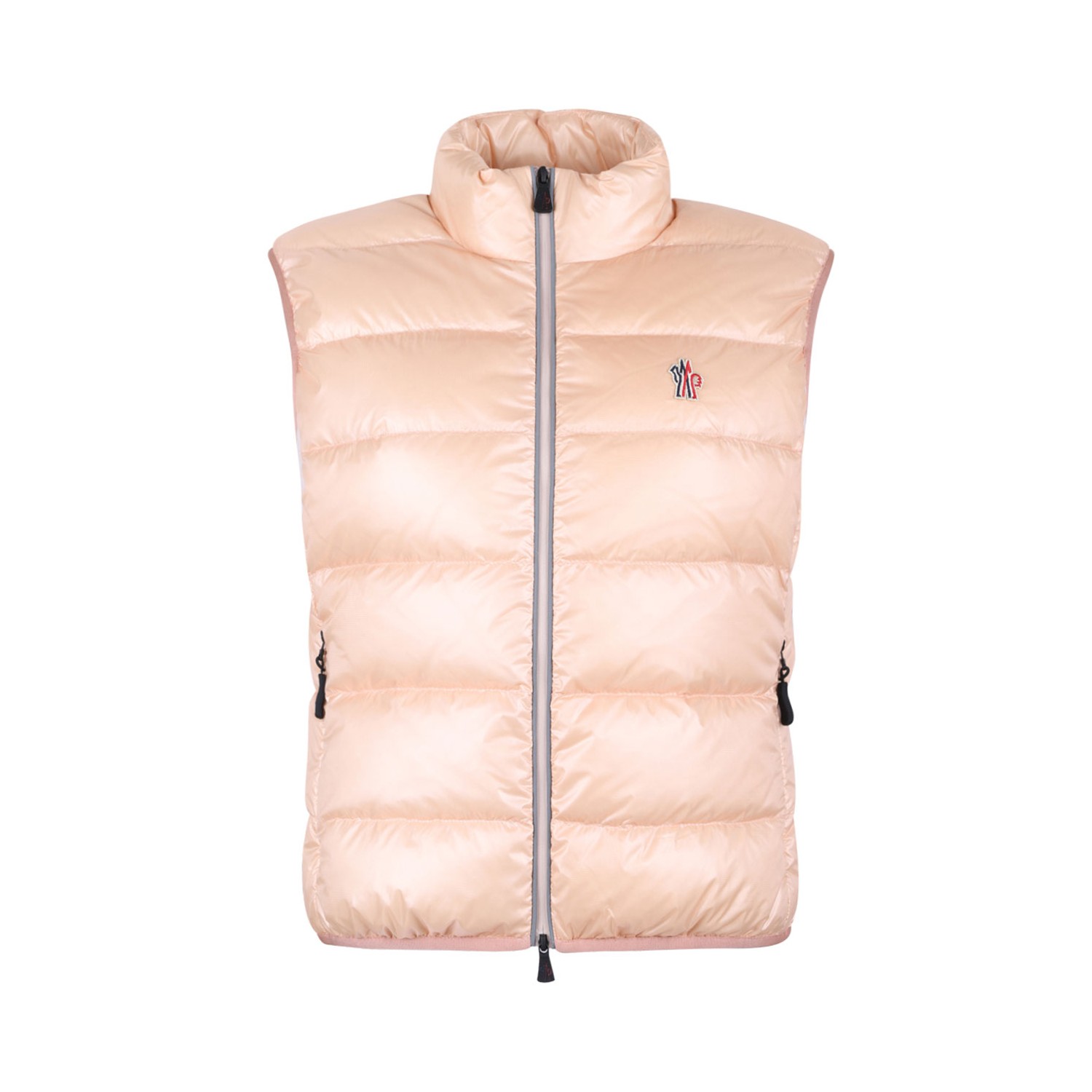 Moncler Light Pink Padded Gilet. Light pink padded gilet with hig neck, front zip fastening, logo patch to the front, front zip pockets.