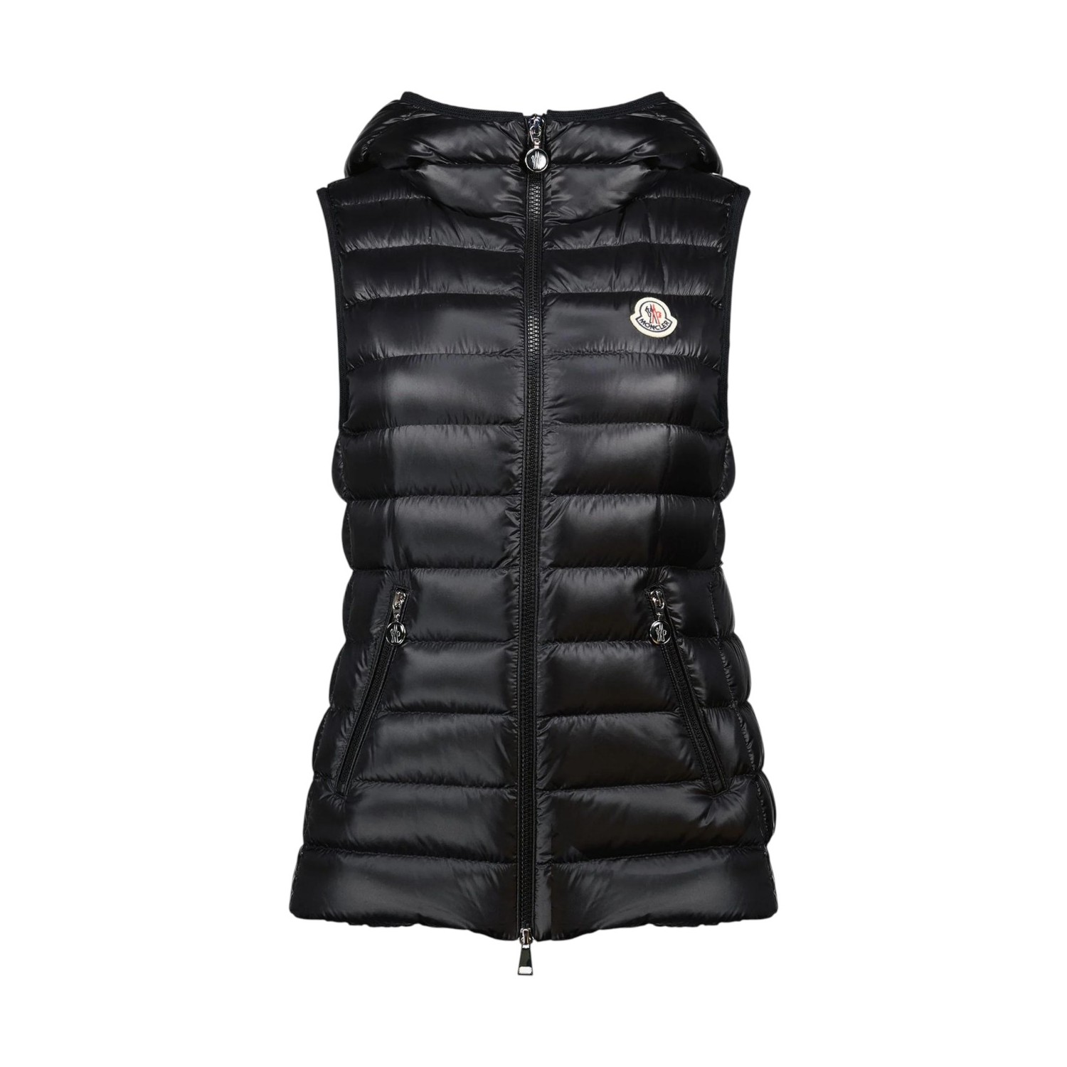 Moncler Black Glossy Hooded Down Gilet. Black sleeveless down gilet with a sleek, contemporary silhouette. Gilet crafted in glossy nylon laque with lightweight down padding for warmth without bulk. Featuring a fixed hood, front zip closure, horizontal quilted boudin stitching, two side zip pockets and iconic Moncler logo patch on the chest for a refined, sporty finish.