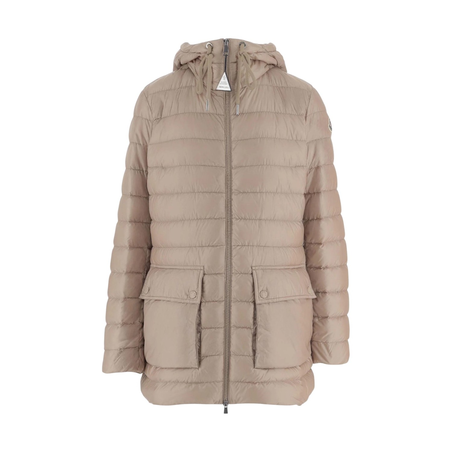 Moncler Jasmine Beige Down Jacket. Beige quilted down jacket with a refined, feminine silhouette. Jacket crafted in lightweight technical nylon with premium down padding for warmth and comfort. Featuring an adjustable hood with drawstring, front zip closure, horizontal boudin quilting, two front flap patch pockets, long sleeves and clean finishes for an elegant yet functional design.