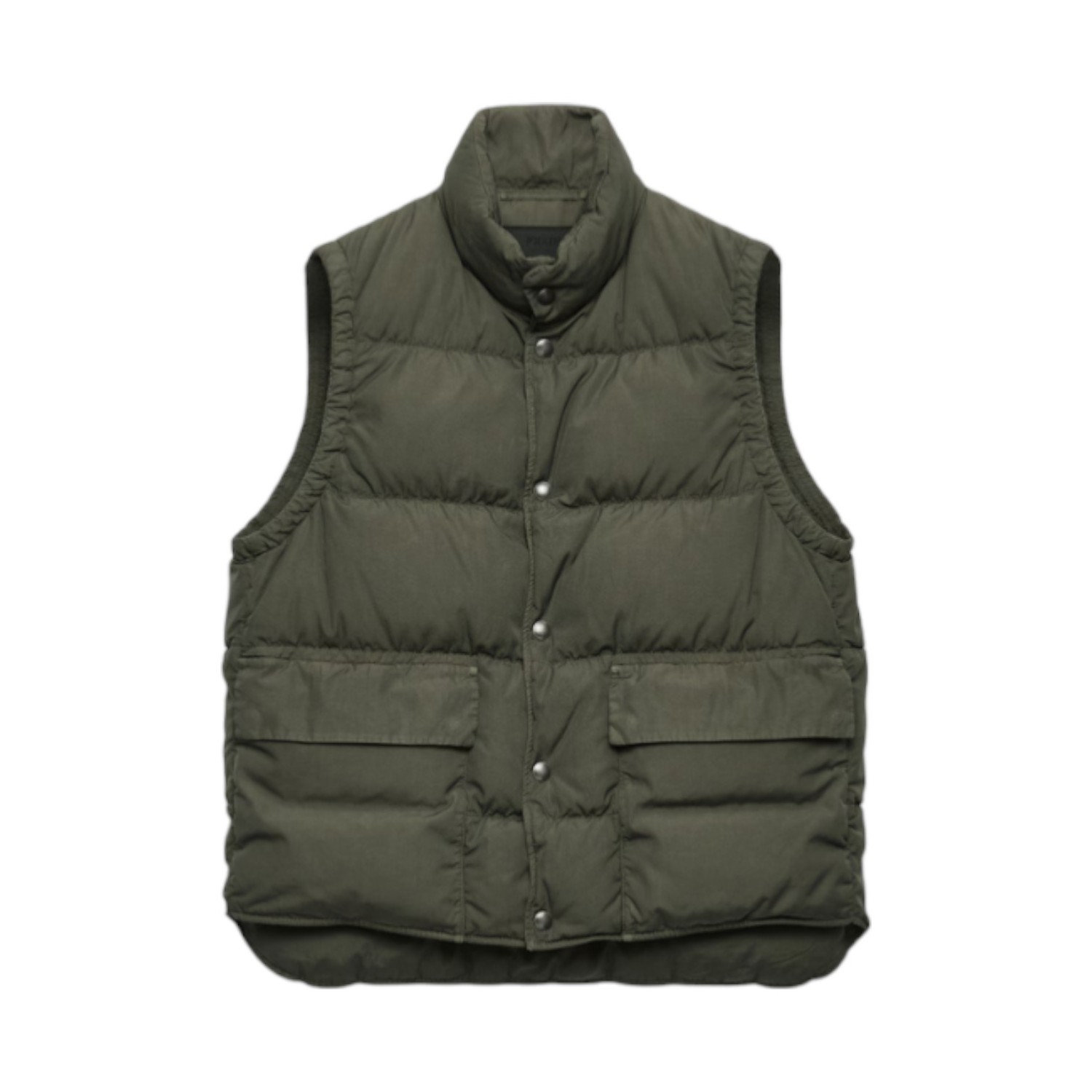 Prada Military Green Cotton Down Vest. Military green sleeveless down vest with a functional, contemporary silhouette. Vest crafted in durable cotton blend fabric with lightweight down padding for warmth and comfort. Featuring a high stand collar, front snap-button closure, horizontal quilting, large front flap pockets and clean, utilitarian detailing for a refined yet practical finish.