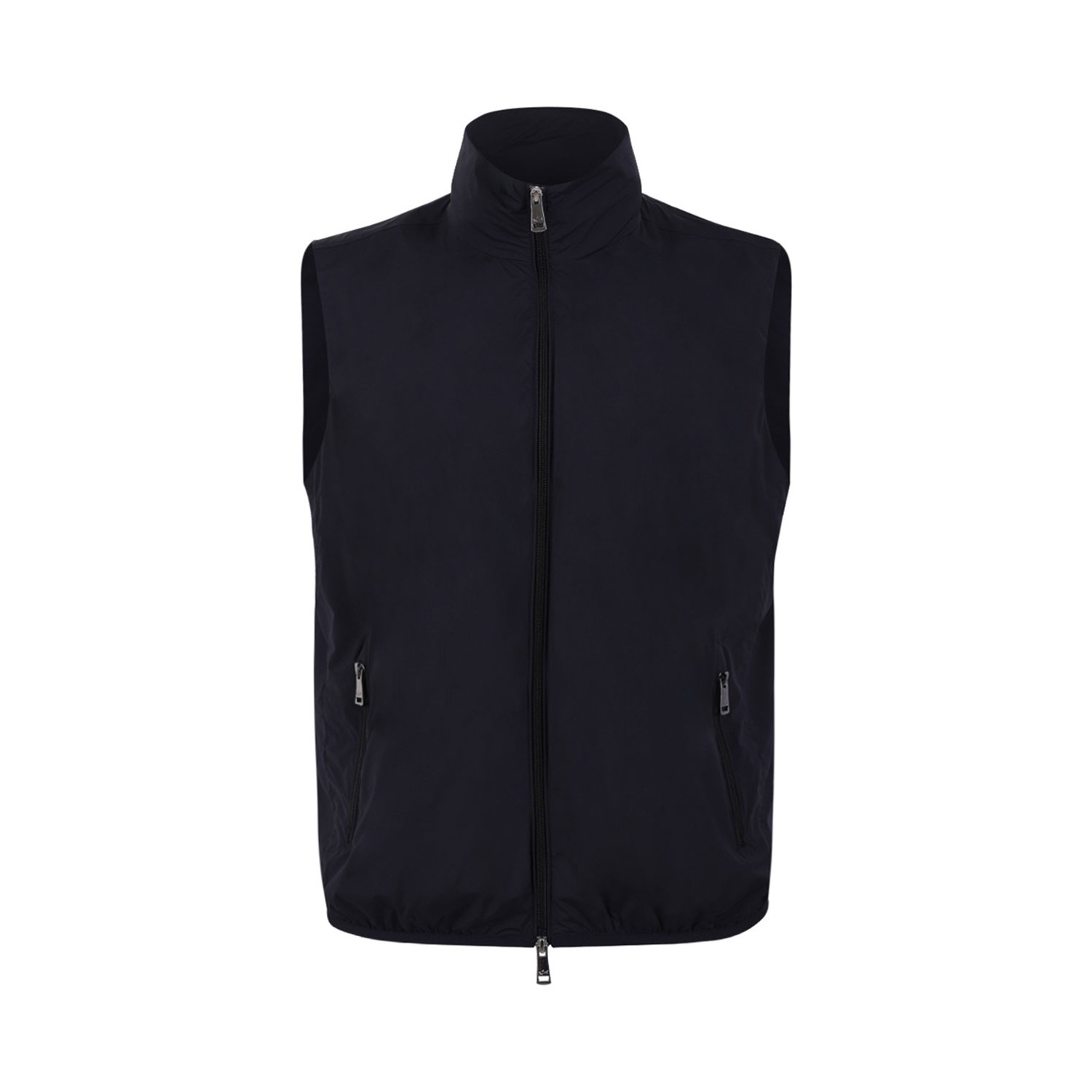 Paul & Shark Navy Blue Zip-Up Vest. Sleeveless vest crafted in navy technical fabric, designed for lightweight comfort and versatility. Featuring a high stand collar and front zip closure for a clean, functional finish. Completed with side zip pockets and a streamlined silhouette that enhances its modern appeal. A refined layering piece that reflects Paul & Shark
