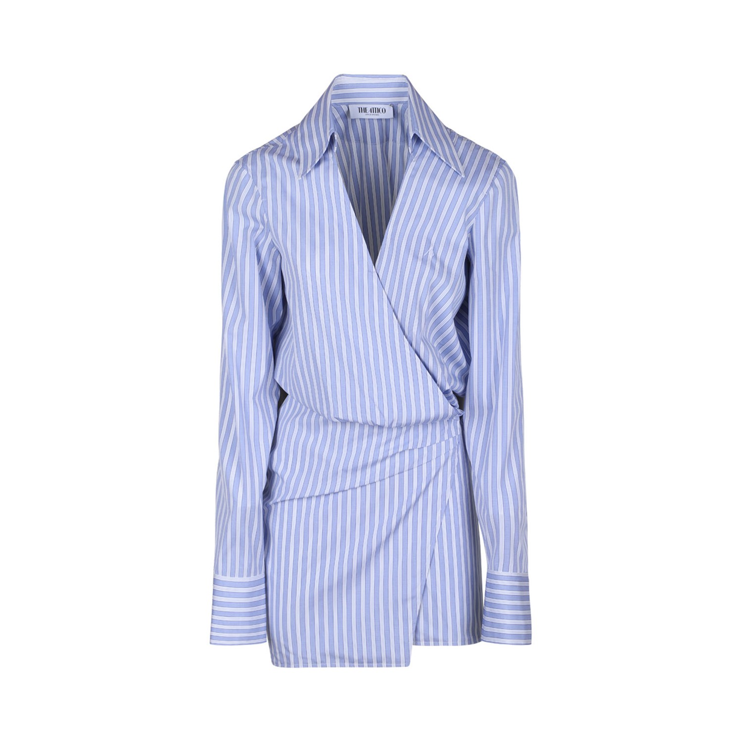 The Attico Striped Mini Dress. White and blue cotton mini dress, off-centre front button fastening, buttoned cuffs, pleat detailing, embroidered logo at the chest.