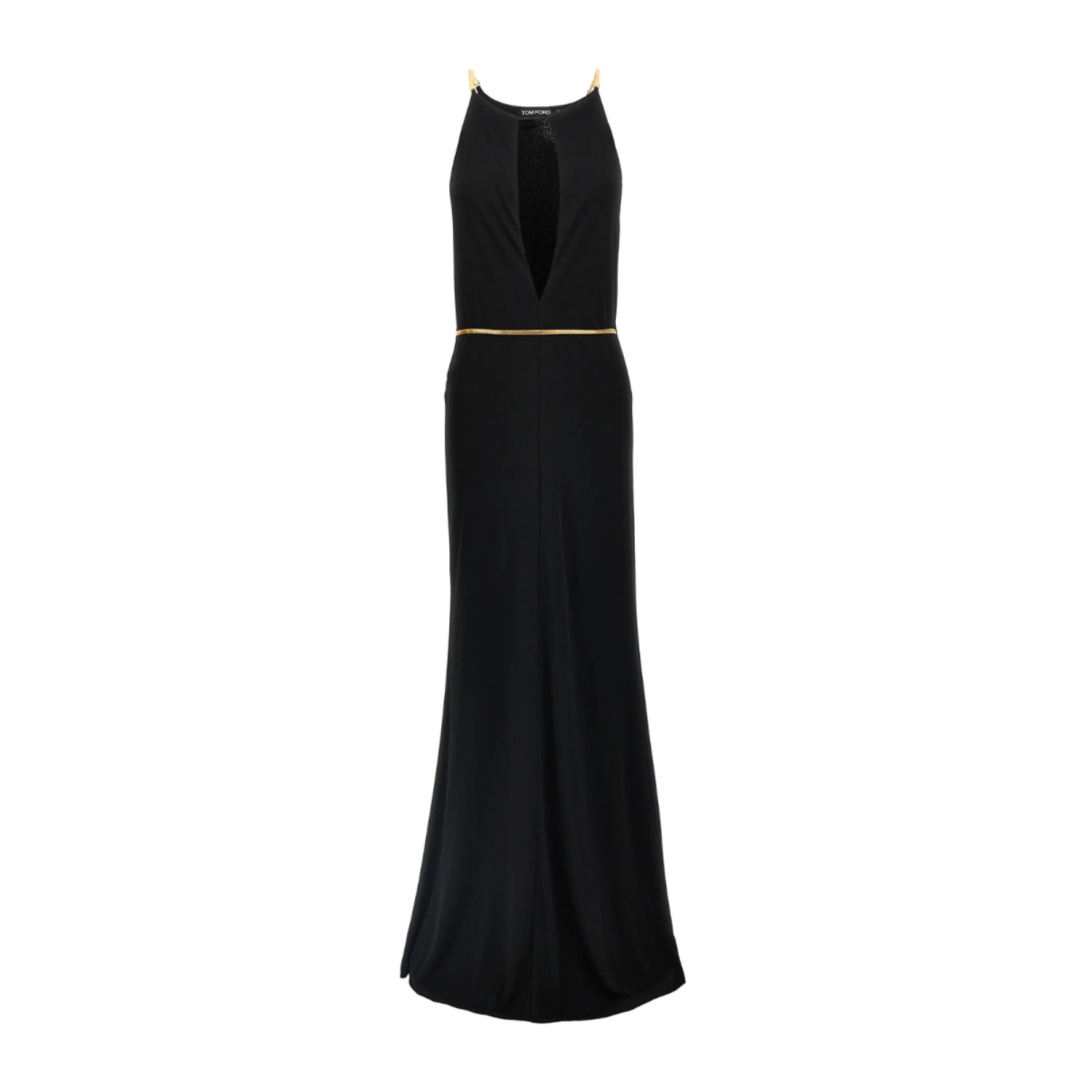 Tom Ford Black Long Dress. Black sleeveless evening dress with deep keyhole drop, deep side cuts with chain details. Gold metal shoulder straps and chain belt, hidden internal belt loops on the back.