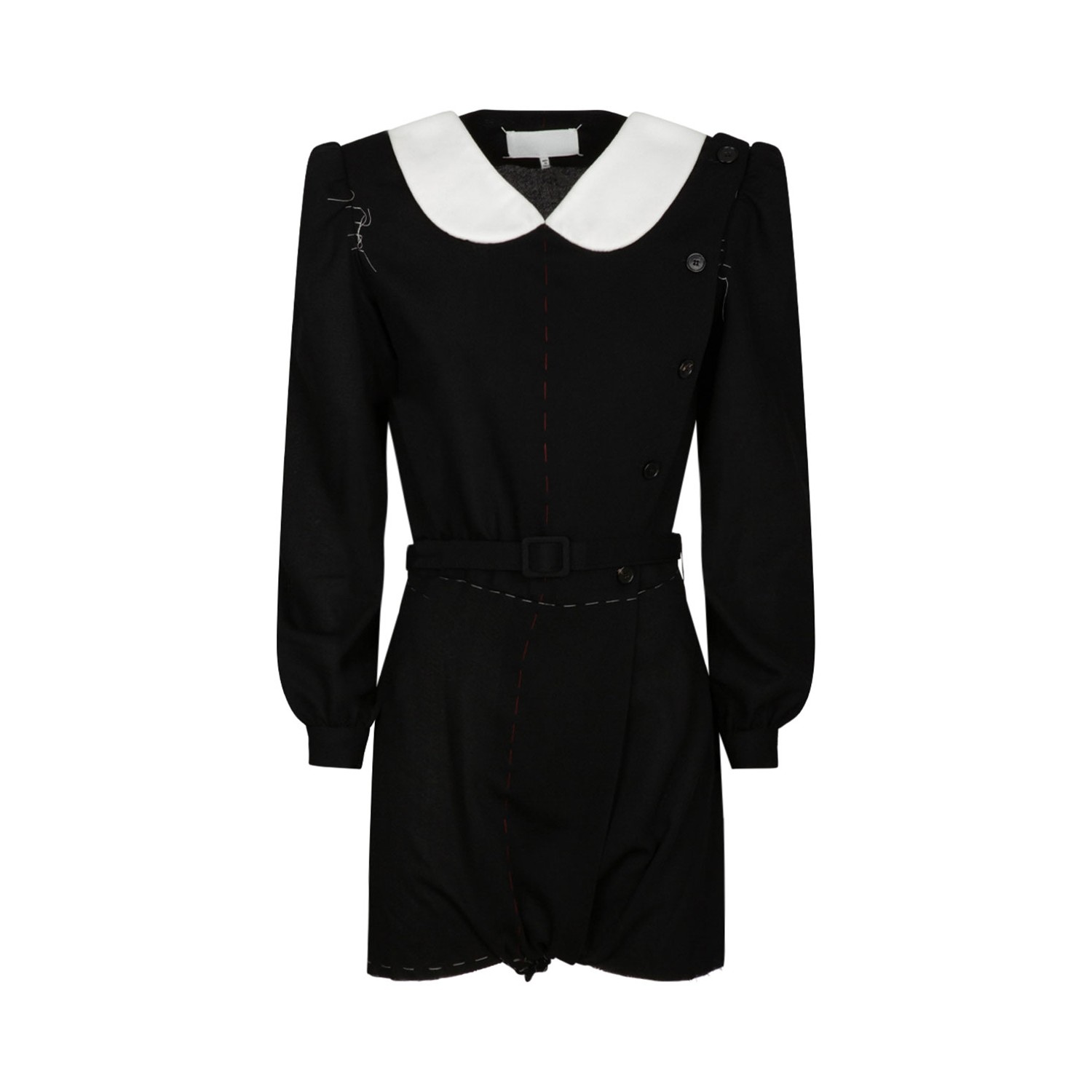 Maison Margiela Black Raw Cut Minidress. Black virgin wool minidress, bib collar, off centre front button fastening, belted waist, signature four stitch logo, long puff sleeves, asymmetric hem. Raw cut finish, contrast stitching, thigh length.