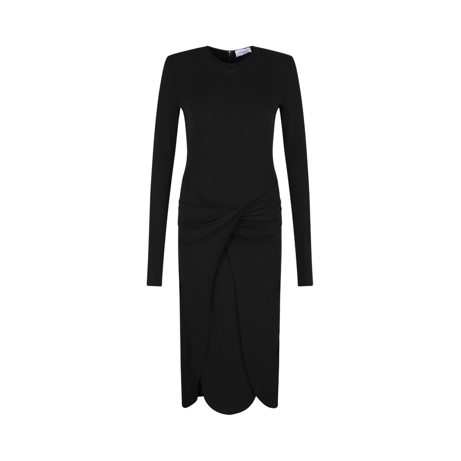 Off White Black Midi Dress. Black crepe texture midi dress, stretch design, high neck, long sleeves. Logo stamp to the front, twist detailing, front slit, below knee length.