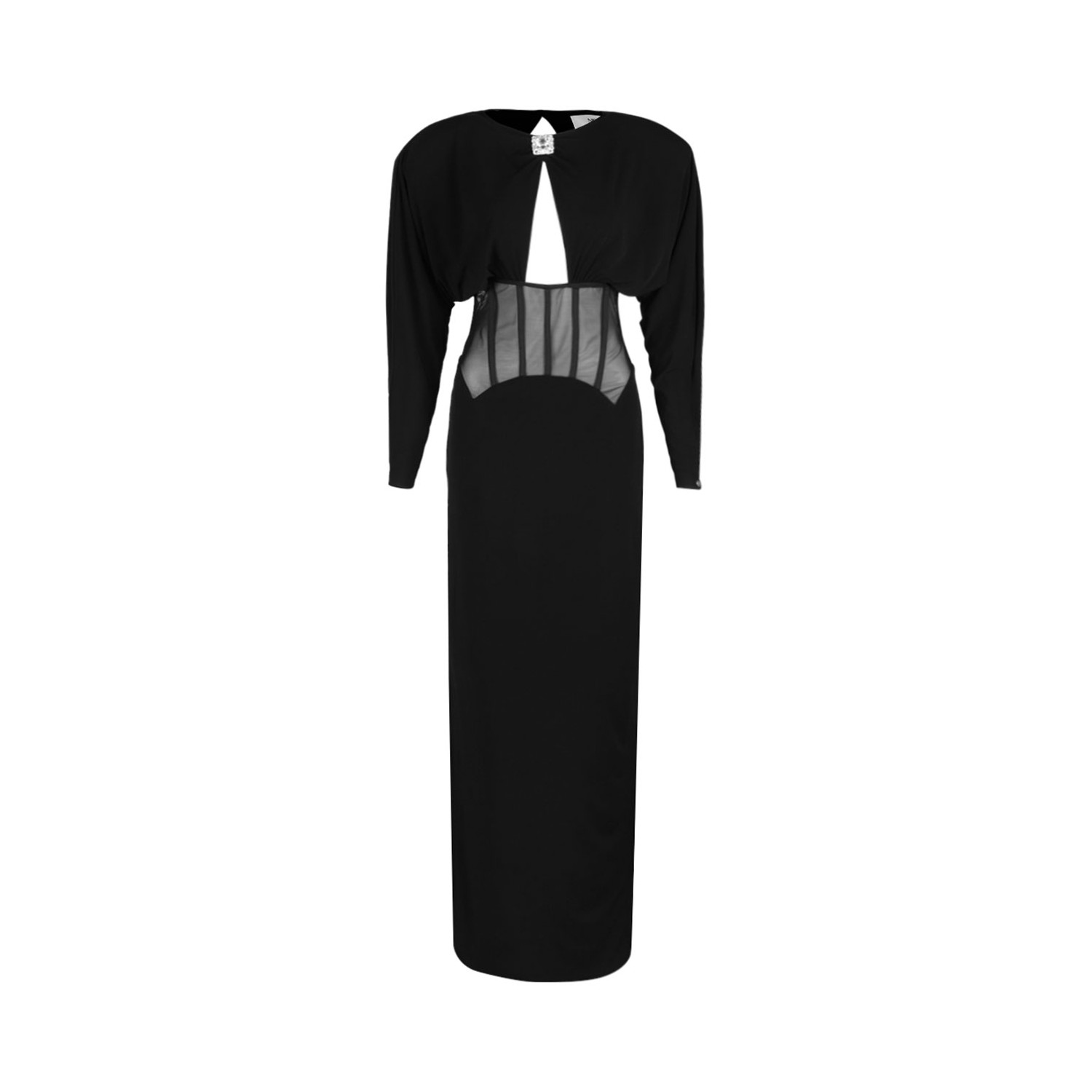 Nissa Black Padded Shoulder Maxi Dress. Black padded shoulder maxi dress with waist corset, keyhole detail, crystal embellishment and zip closure.