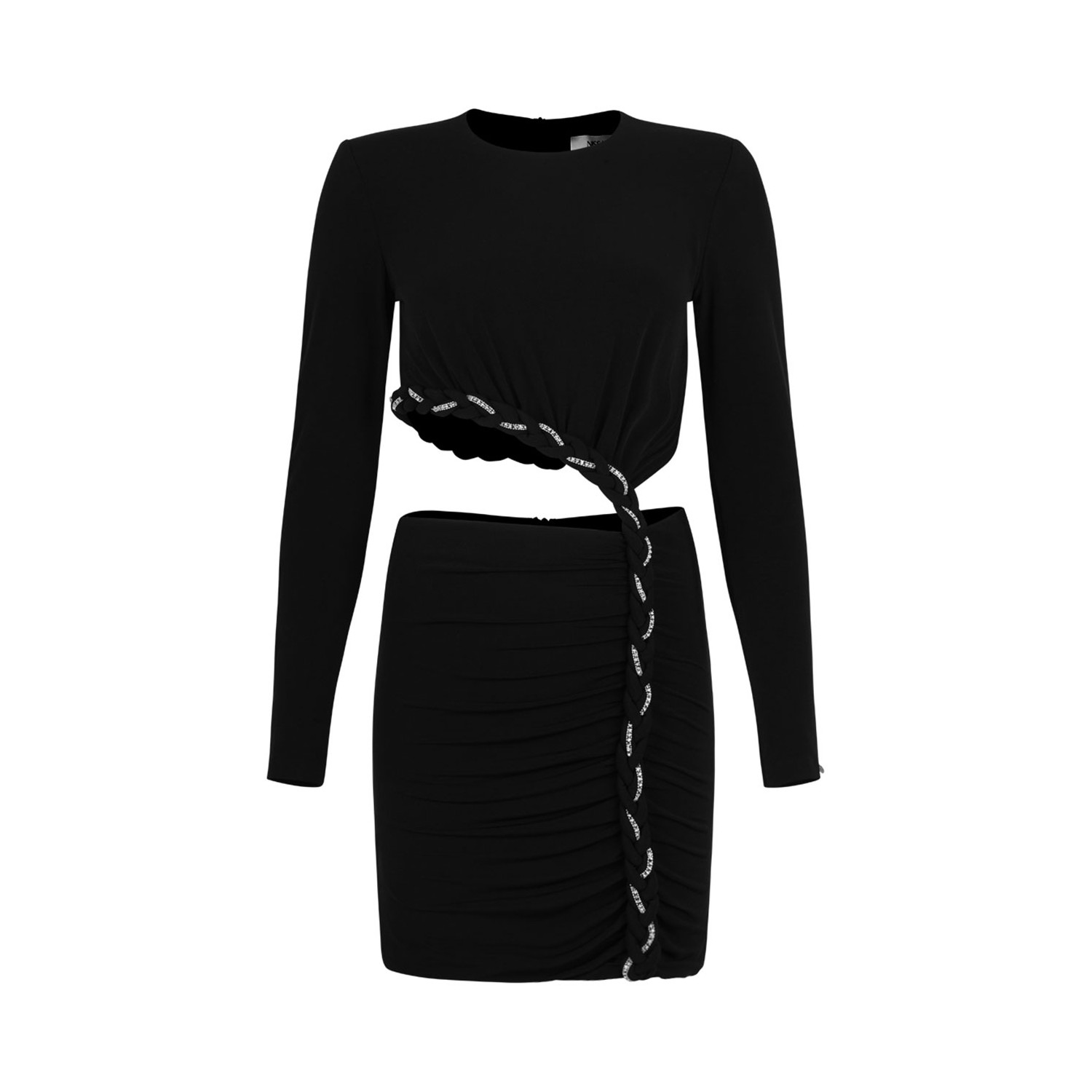 Nissa Black Shoulder Pads Jersey Mini Dress. Shoulder-pads jersey mini dress in stretch fabric with mini length, long sleeved, cut-out detailing. Collar at the base of the neck, oversized shoulders, faceted crystals, zipper closure.