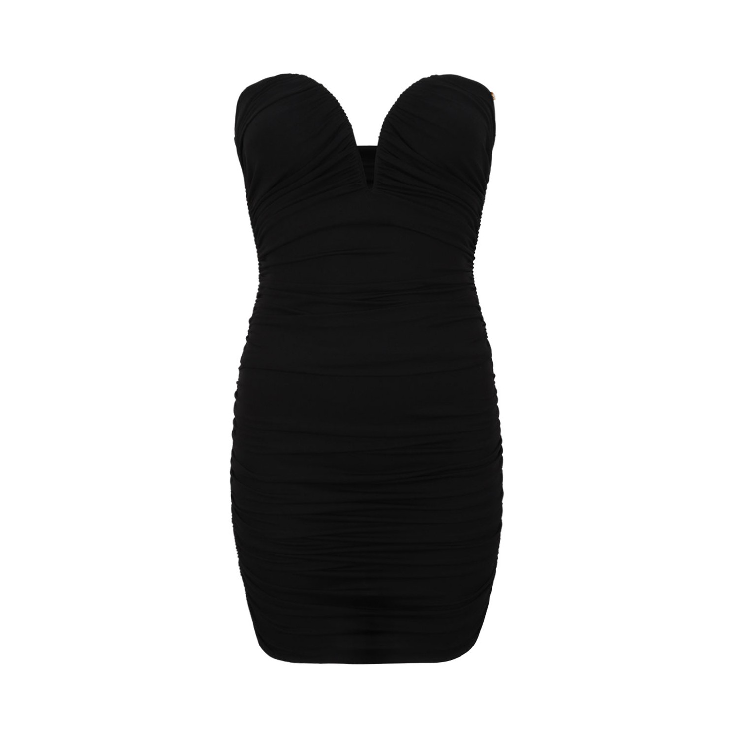 Elisabetta Franchi Black Mini Dress In Crepe Jersey Fabric. Black mini dress in crepe jersey fabric with a deep sweetheart neckline, off shoulder, detail in golden metal with logo, concealed zip.