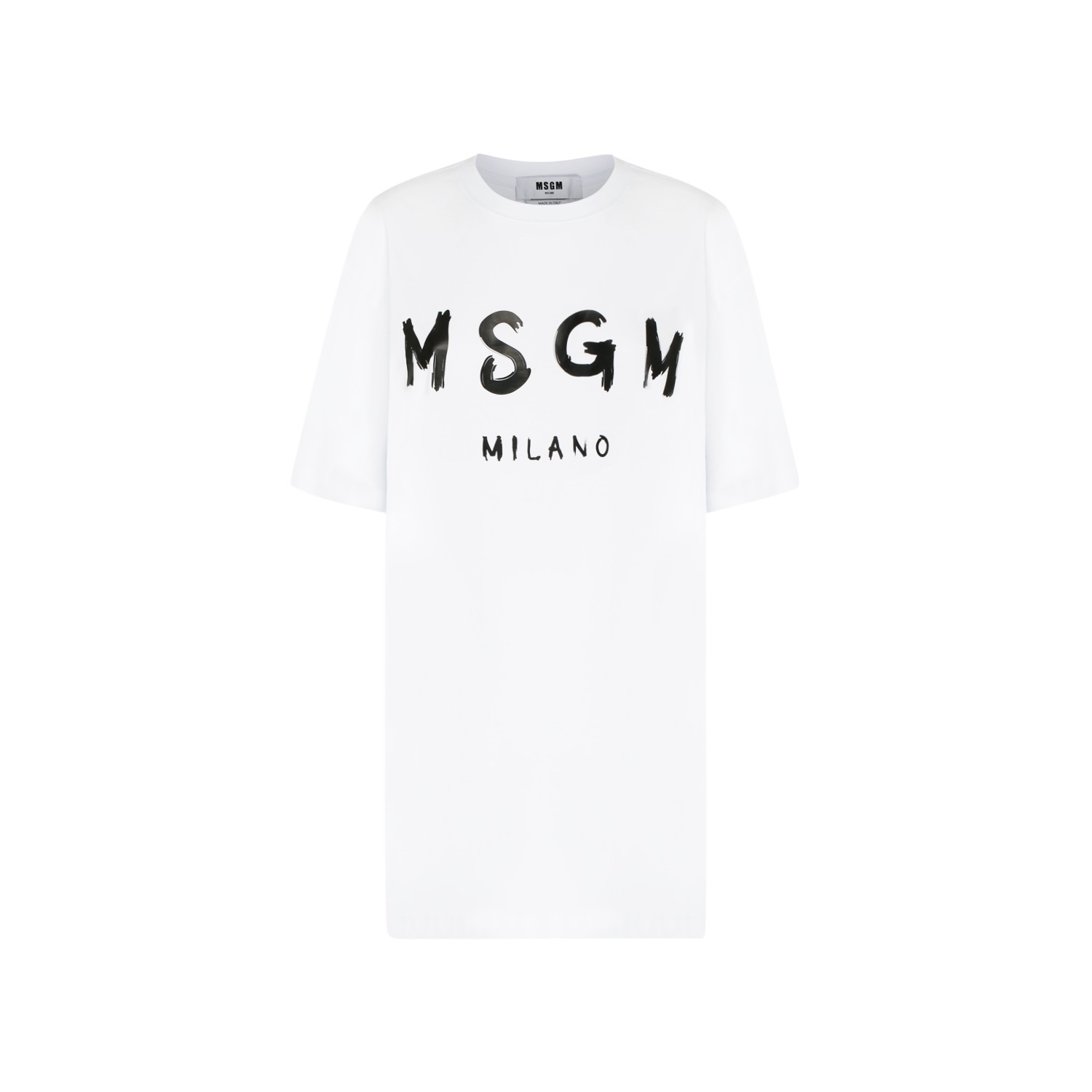 MSGM White Logo Print T-Shirt Dress. White cotton t-shirt dress, black logo print to the front, short sleeves, round neck, straight hem.