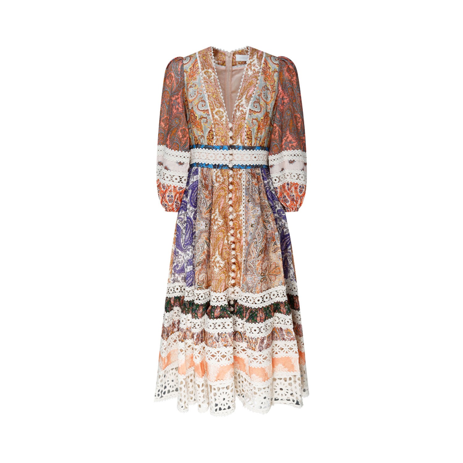 Zimmermann Multicolor Linen Devi Printed Midi Dress. Multicolor linen midi dress, crochet trim, mix print, V-neck, concealed rear zip fastening, decorative button detailing, long puff sleeves, two side slit pockets, flared skirt, mid-length.