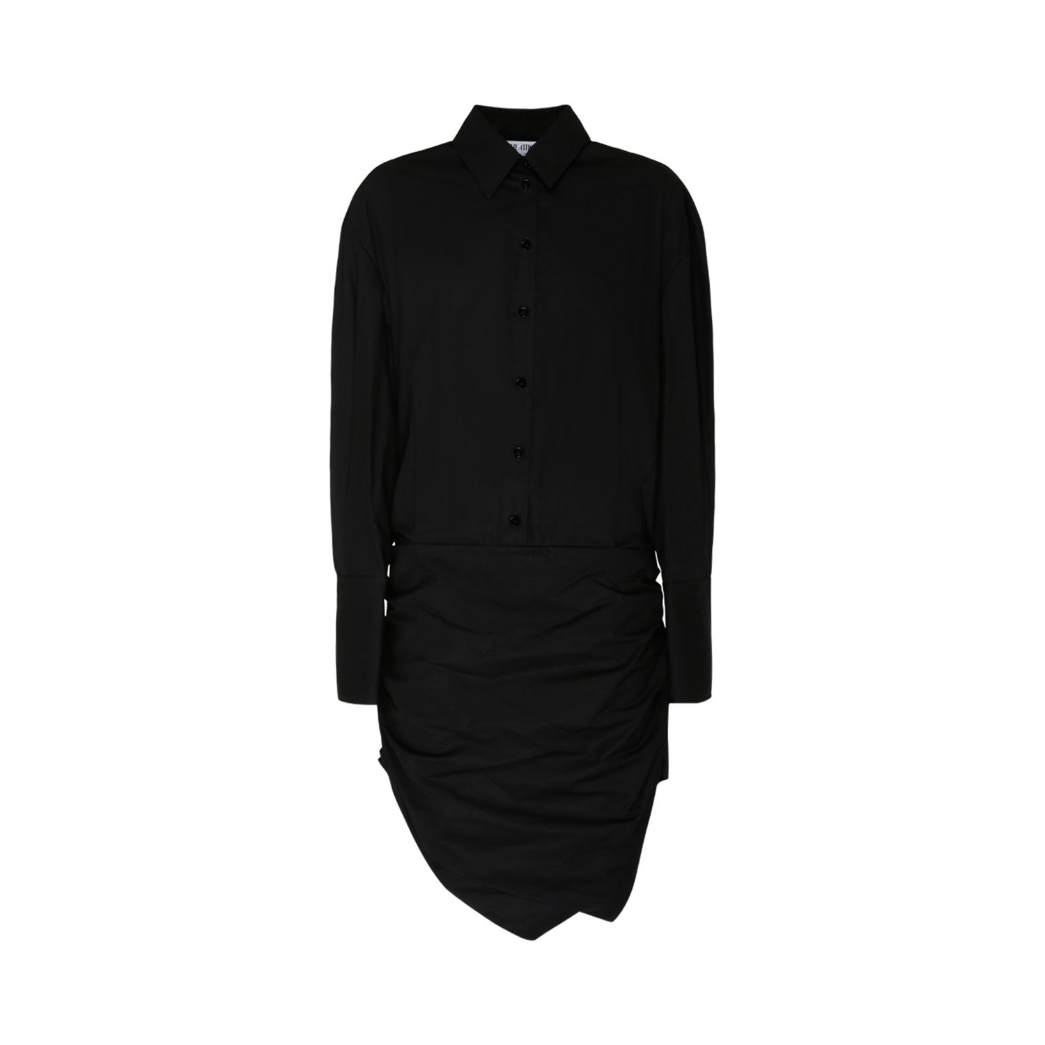The Attico Black Asymmetric Hem Cotton Shirt Dress. Black cotton shirt dress, classic collar, long sleeves, front button fastening, buttoned cuffs, asymmetric hem.