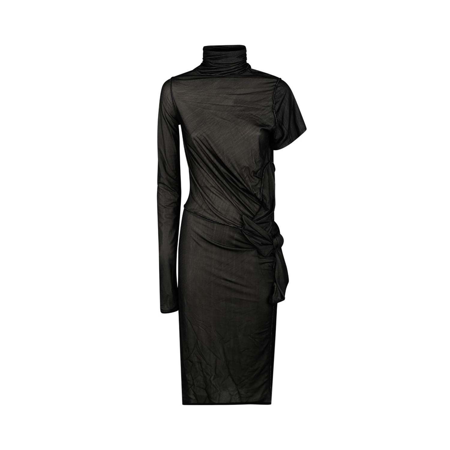 Maison Margiela Black Asymmetrical Midi Dress. Black asymmetrical midi dress featuring a ruffle detail with decorative tie on the side. Asymmetric sleeves. High collar, exposed seams and loose threads for an unfinished effect. On the back are the brand's Four stitches.