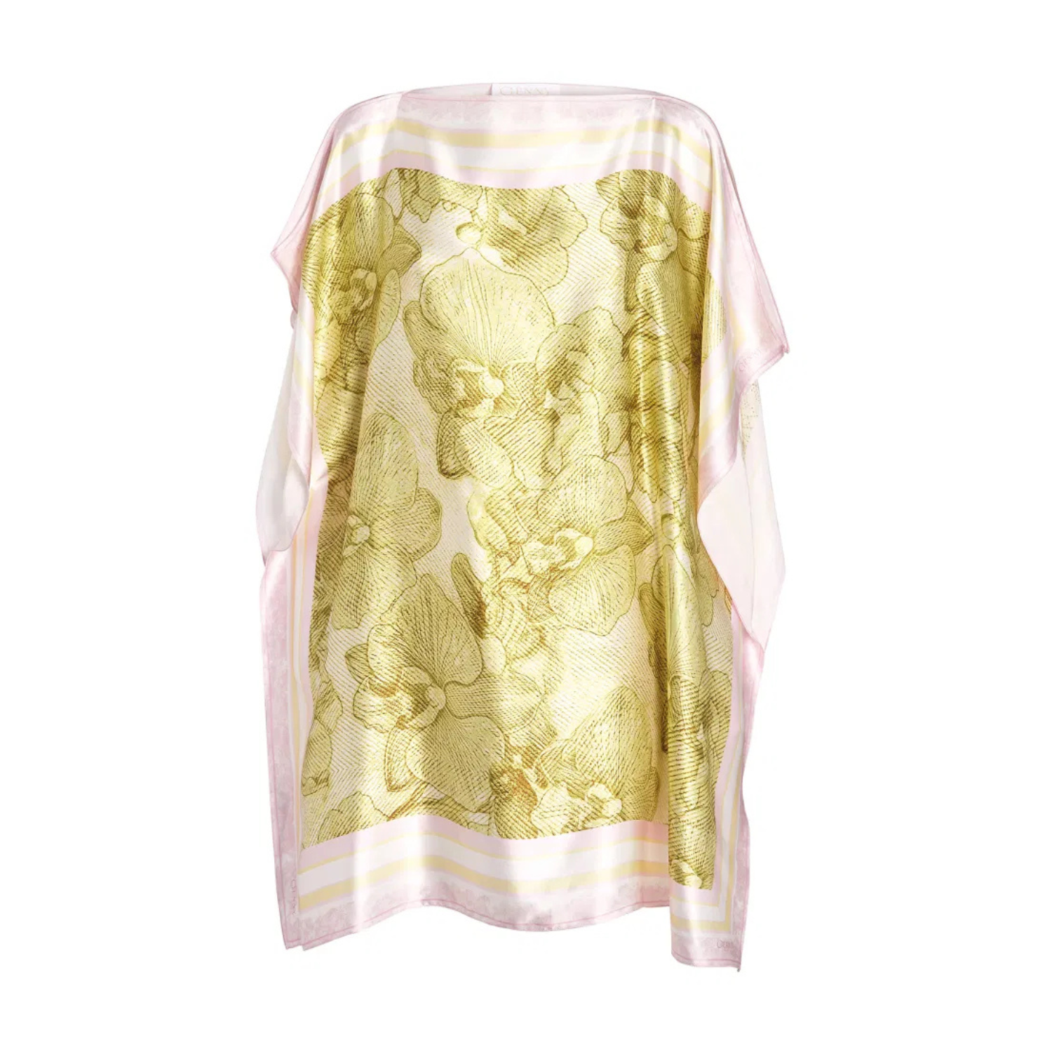 Genny Orchid Kaftan In Pure Silk. Pure silk kaftan, featuring soft, flowing lines that effortlessly follow movement. The Orchid print, the Maison's signature flower, embellishes the piece with a refined and distinctive elegance. The boat neckline and wide sleeves lend lightness and harmony to the silhouette. An ideal piece for embracing the summer season with style.