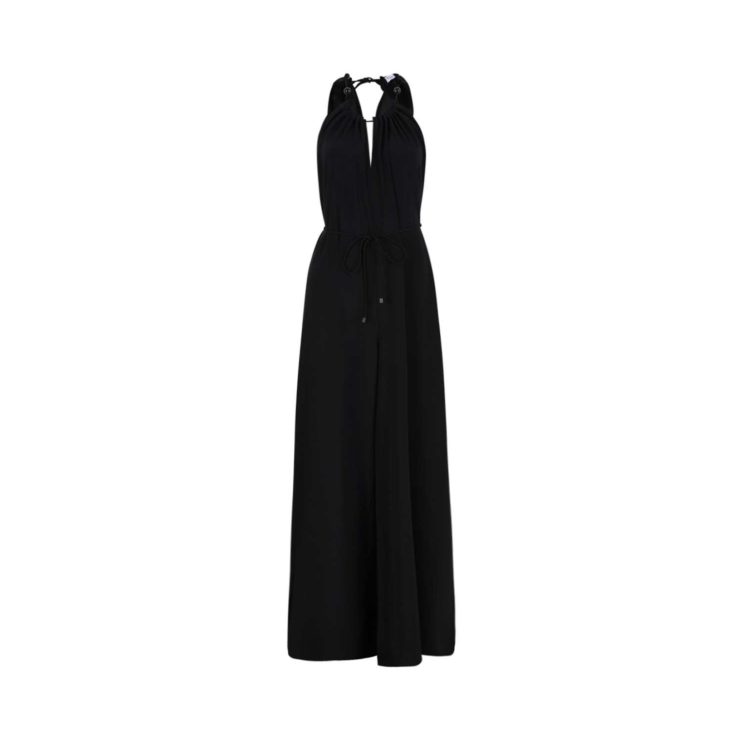 Max Mara Black Draped Long Jumpsuit. Black long jumpsuit defined by fluid elegance and contemporary sophistication. Crafted in a lightweight, softly draping fabric, this Max Mara tuta features a refined halter neckline with delicate gathering that enhances its feminine silhouette. The sleeveless design highlights the shoulders, while the elasticated waist subtly defines the figure and ensures comfort. The wide-leg cut creates graceful movement and an elongated line, embodying effortless refinement. Finished with meticulous Italian craftsmanship, this versatile piece is perfect for elegant evening occasions and elevated modern styling.