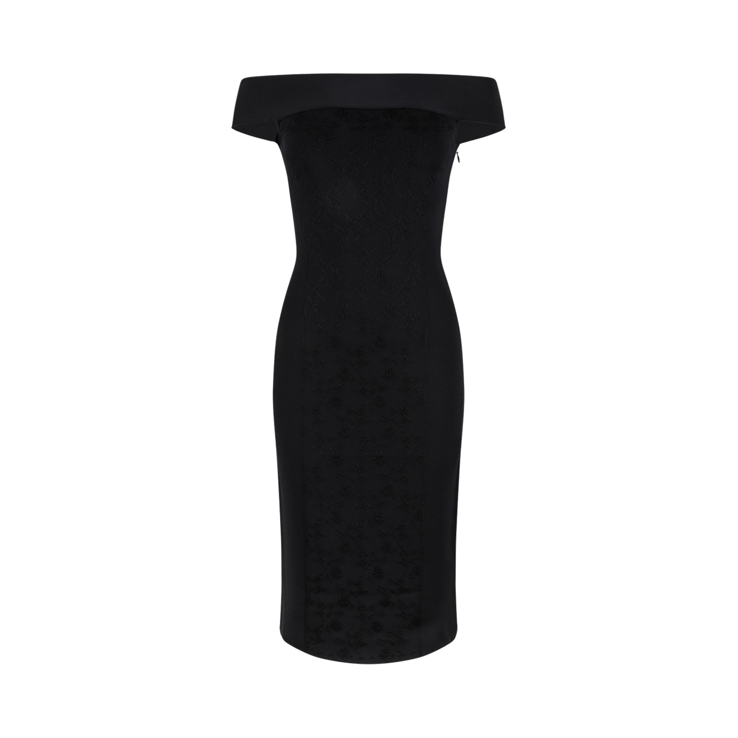 Alexander McQueen Black Strapless Tailored Dress. Black dress defined by a sleek, sculptural silhouette. Crafted from refined structured fabric, this Alexander McQueen dress features an elegant strapless neckline with a distinctive folded band detail that enhances the architectural design of the bodice. The fitted construction follows the natural lines of the body, creating a flattering and elongated silhouette that falls into a sophisticated knee-length skirt. The minimalist aesthetic is elevated by precise tailoring and clean lines, reflecting the brand