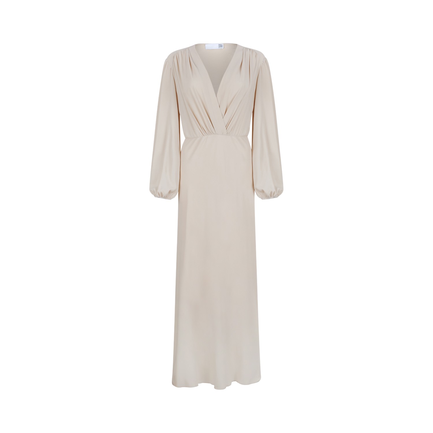 Douuod Beige Draped Midi Dress. Beige midi dress defined by a fluid, feminine silhouette and understated Douuod elegance. Crafted from lightweight, softly draping fabric, this dress features a deep V-neckline and gently gathered shoulders that enhance the natural flow of the design. The long sleeves add balance and sophistication, while the softly cinched waist creates a flattering shape that moves effortlessly with the body. The fluid skirt falls gracefully to a midi length, emphasizing the garment