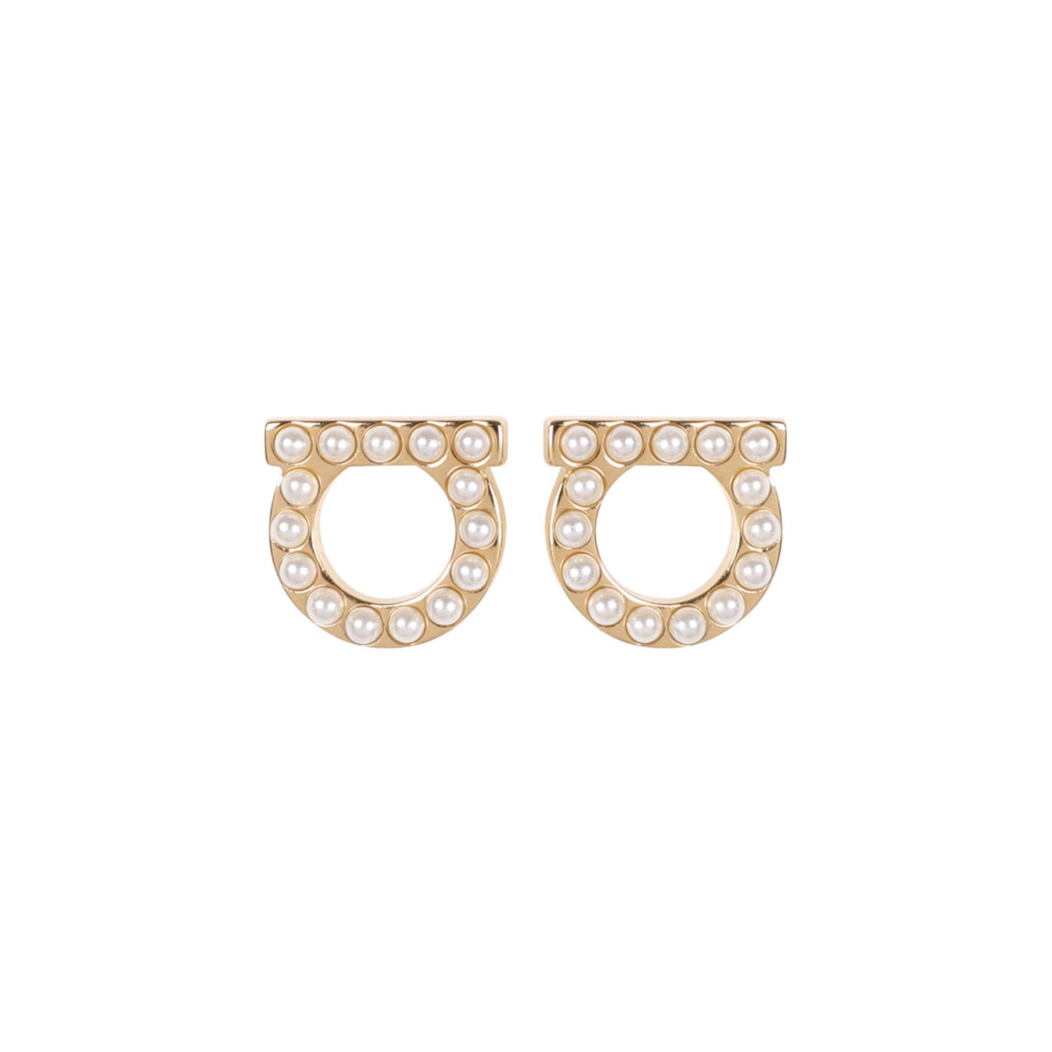 Ferragamo Gold Tone Gancio Earrings. Gold tone earrings with stud design, Gancini logo studs. Bead embellishment, butterfly fastening, for pierced ears.