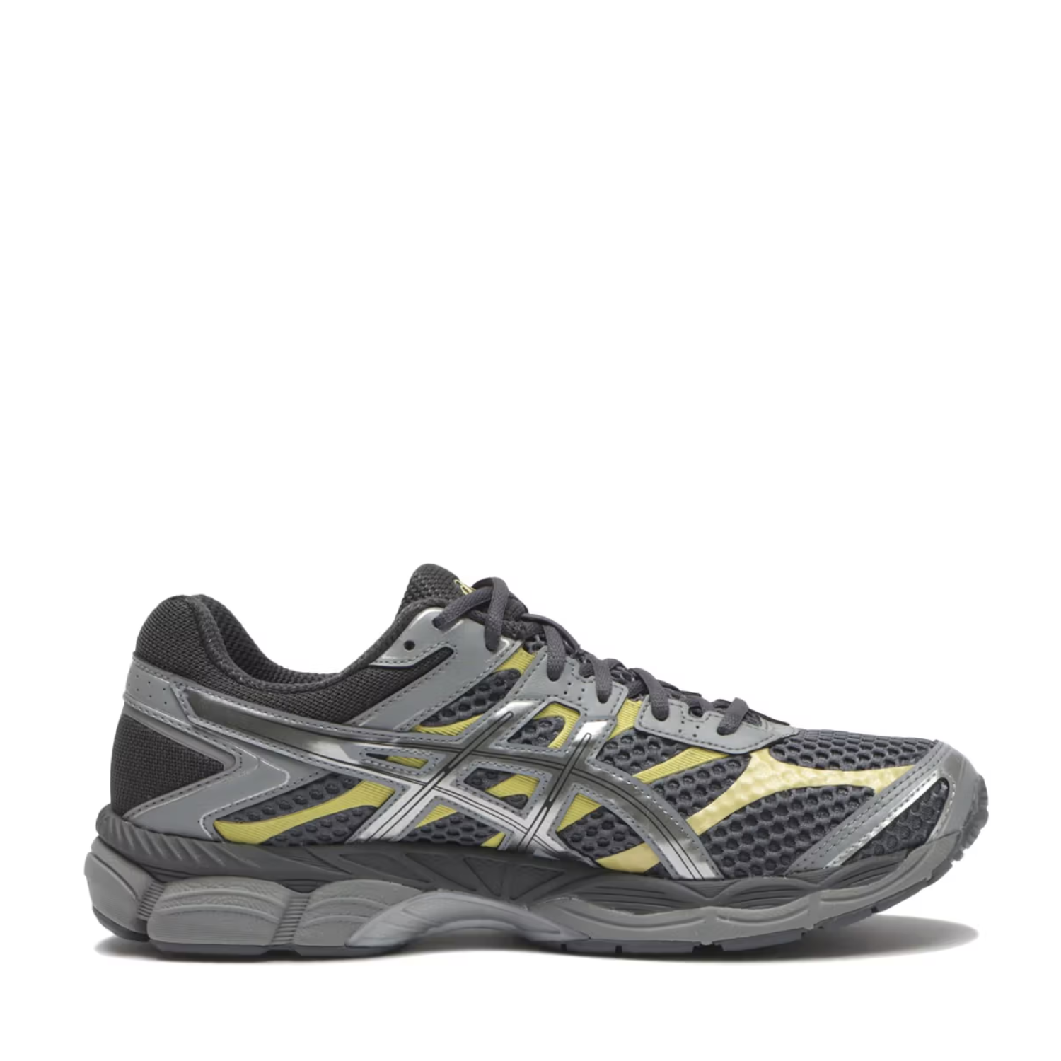 Asics Carrier Grey and Pure Silver GEL-CUMULUS 16 Sneakers. The ASICS GEL-CUMULUS 16 debuts in a bold new “Carrier Grey/Pure Silver” colorway, blending retro-futuristic appeal with vibrant color accents. The upper is crafted from breathable “Carrier Grey” mesh, layered with yellow and “Pure Silver” synthetic overlays that add structure and durability while creating a subtle reflective effect. The design is further enhanced by seamless paneling and open mesh overlays, recalling the technical beauty of early 2010s silhouettes. Branding is subtle yet prominent, with the ASICS logo integrated into the side panels and tonal details on the tongue, while the laces follow the soft gray palette for a cohesive look.