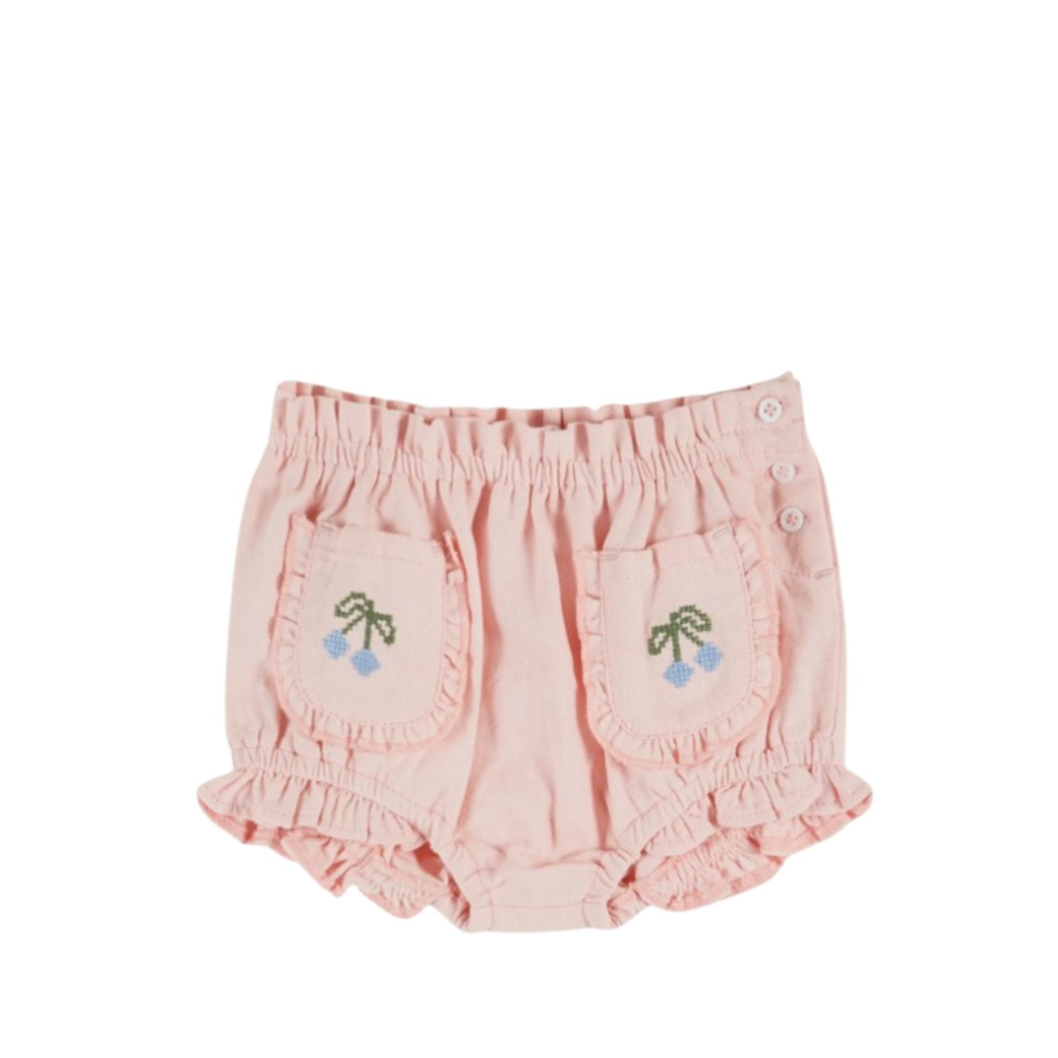 Bloomer pink embroidered pockets. Pink organic cotton canvas bloomers. Puffed shape. Elasticated waistband with ruffled effect. Opening with natural mother-of-pearl buttons on one side. Elasticated thigh circumference. Ruffle attached around the thighs. Ruffled pockets embroidered with cherries in cross stitch on the front.
