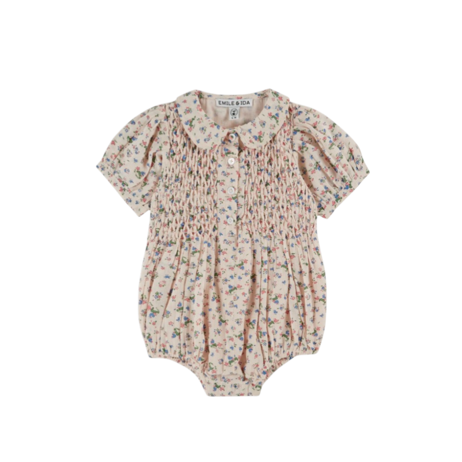 Combibloomer pink Patterned Smocked. Combibloomer in pink cream organic cotton gauze printed with chickens among the flowers. A charming print as refreshing as the material. Puffed shape. Crew neckline. Claudine collar. Buttoned opening at the height of the smocks. Bodice delimited at the front by handmade smocks. Balloon sleeves tightened by a cuff. Elasticated thigh circumference. Pressed crotch. Flat back. Fully lined.