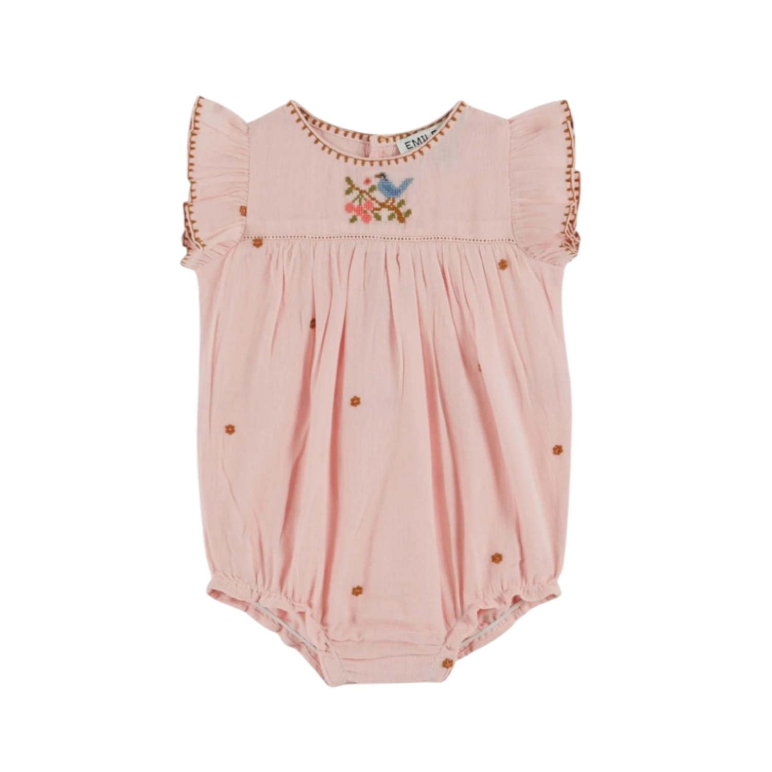 Combibloomer embroidered pink flowers. Combibloomer in soft pink organic cotton gauze embroidered all-over with caramel flowers. It is embellished with caramel embroidery in grebiche stitch around the neckline and ruffles, on the yoke with a blue bird on a cherry tree branch embroidered in cross stitch by Indian artisans. Round neckline. Ruffles around the edges. Front yoke delimited by ladder openings. Gathers under the yoke. Buttoned openings in the back. Elasticated thigh circumference. Snaps at the crotch. Fully lined.