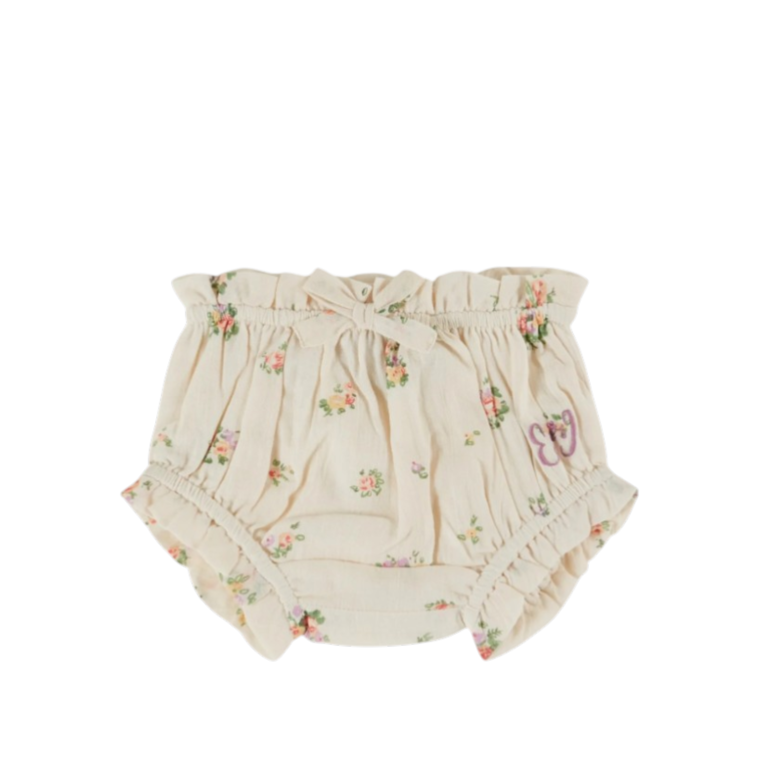 Bloomer fleuri althea. Bloomers in pink cream organic cotton gauze printed with all-over bouquets of flowers. Puffed shape. Elasticated waistband. Elasticated thigh circumference. Decorative bow at the waist. Biased ruffle around the waist and thighs. E&I monogram embroidered on one side. Fully lined.