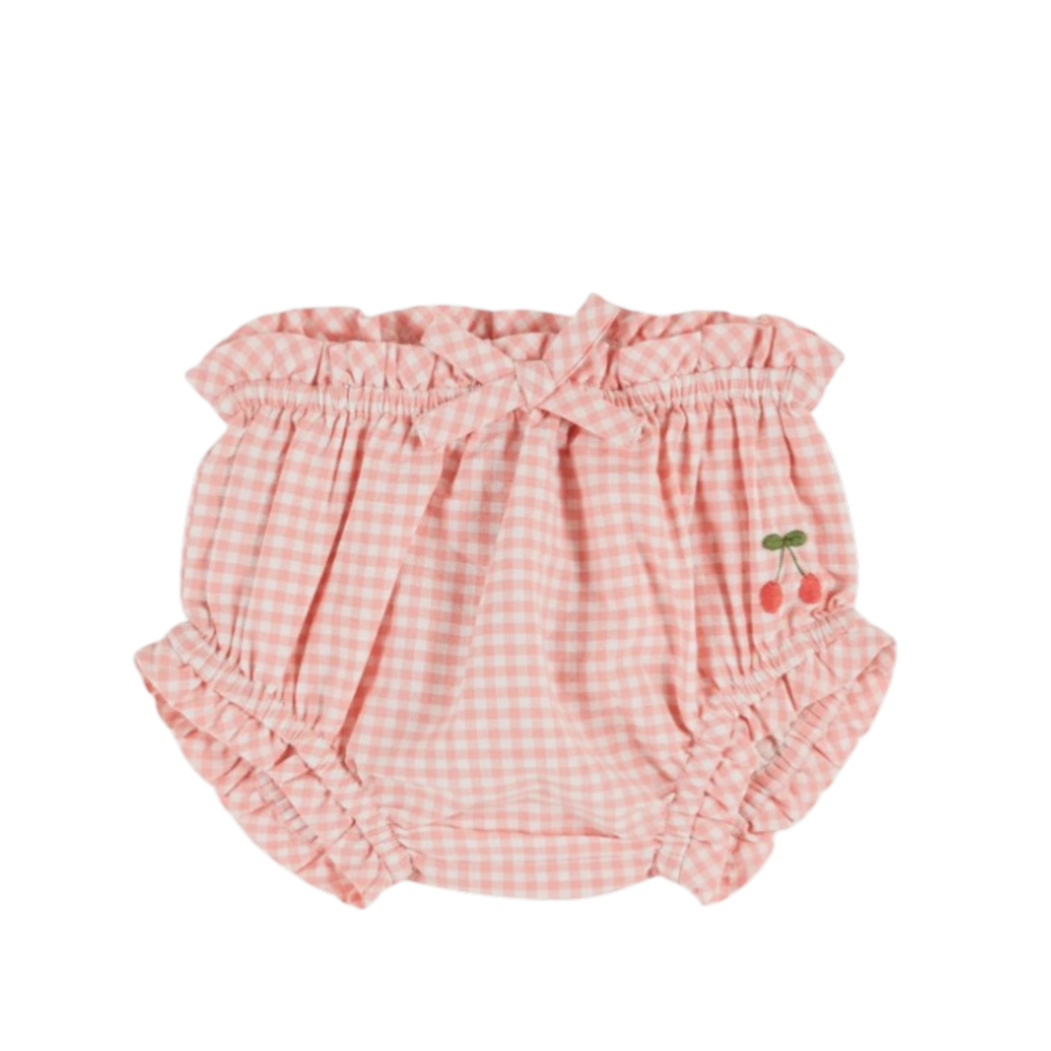 Bloomers pink gingham. Bloomers in gingham organic cotton with small pink and ecru checks for spending holidays in Saint-Tropez or elsewhere. Bloomers with a t-shirt or panties under a dress to complete the look. Puffed shape. Elasticated waistband. Elasticated thigh circumference. Decorative bow at the waist. Biased ruffle around the waist and thighs. Bouquet of cherries embroidered on one side. Fully lined.