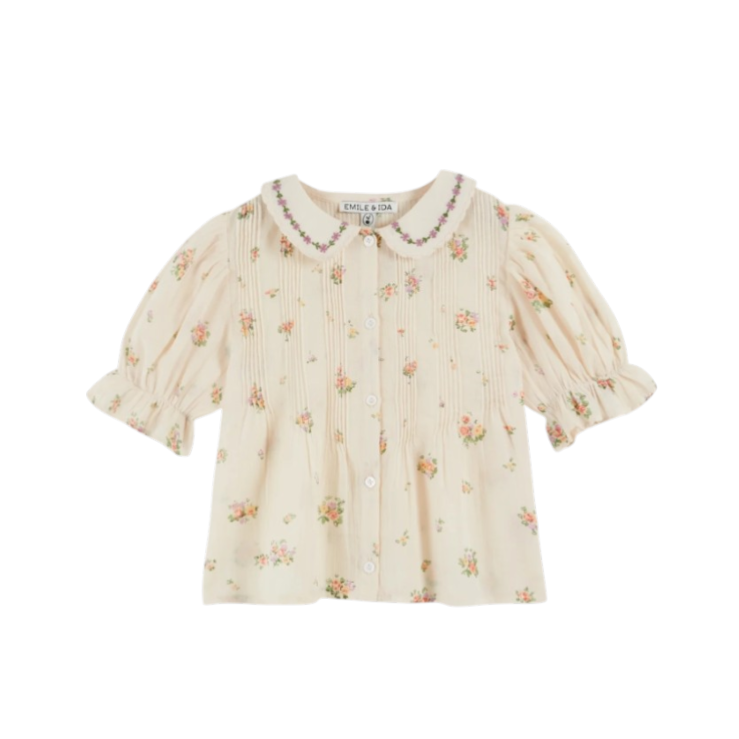 Blouse floral althea. Pink cream organic cotton gauze blouse printed with all-over bouquets of flowers. Claudine collar embroidered with a garland of flowers and scalloped, like the bottom of the elasticated balloon sleeves. Full-length buttoned front opening. Series of folds lying in front up to mid-height. Series of lying folds in the back. Side and sleeve assemblies with French seam.
