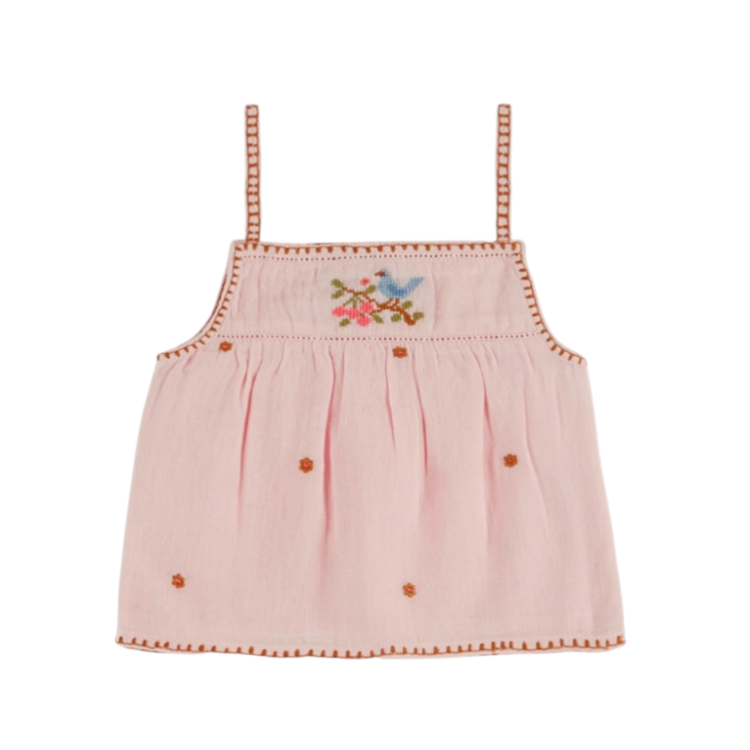 Top embroidered pink flowers. Pastel pink cotton gauze tank top embroidered with small yellow ochre flowers all over.A simple cut embellished with a few details that make this piece truly unique. A garment full of tenderness. Ladder stitching. A beautiful blue bird embroidered in cross-stitch. Grebiche stitching highlighting the straps. Natural mother-of-pearl buttons on one side. Lined, flared, lightweight top that allows air to circulate.