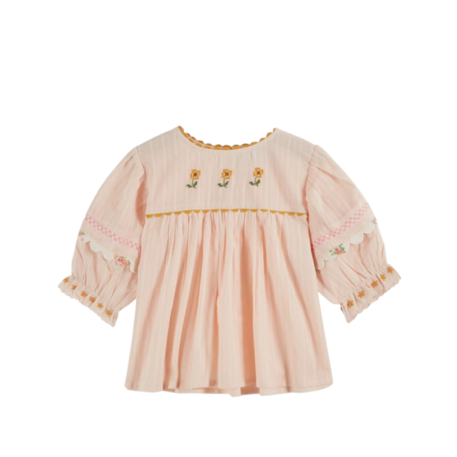 Blouse embroidered pink flowers. Pink cotton blouse lined with tiny ladder days. The fabric alone is a little marvel. Lined yoke and round neckline edged with yellow ocher croquet. Flowers embroidered in cross stitch on the yoke and at the bottom of the sleeves. Elasticated balloon sleeves, ruffled and scalloped at the bottom. Gathers supported by the yoke. Small back opening. English seams.