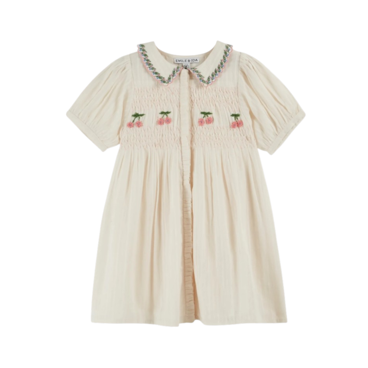 Dress cream smocked embroidery. Pink smocked ecru cotton dress. The fabric alone is a little marvel. A magnificent piece where the fabric harmonizes wonderfully with the delicacy of the smocking handmade by Indian artisans. A dress full of charm and finesse, which is suitable for small and large events as well as the schoolyard. Wide shape. Crew neckline. Scalloped flat collar hemmed with pink satin stitch, highlighted with a garland of flowers. Small yoke at the top of the bodice. Hand-embroidered pink flowers interspersed between two lines of smocking. Balloon sleeves with buttoned cuffs. Gathered skirt under the bodice. Flat back bodice. Button placket running the length of the dress hidden under a ruffle. Fully lined in cotton voile. Length above the knee.