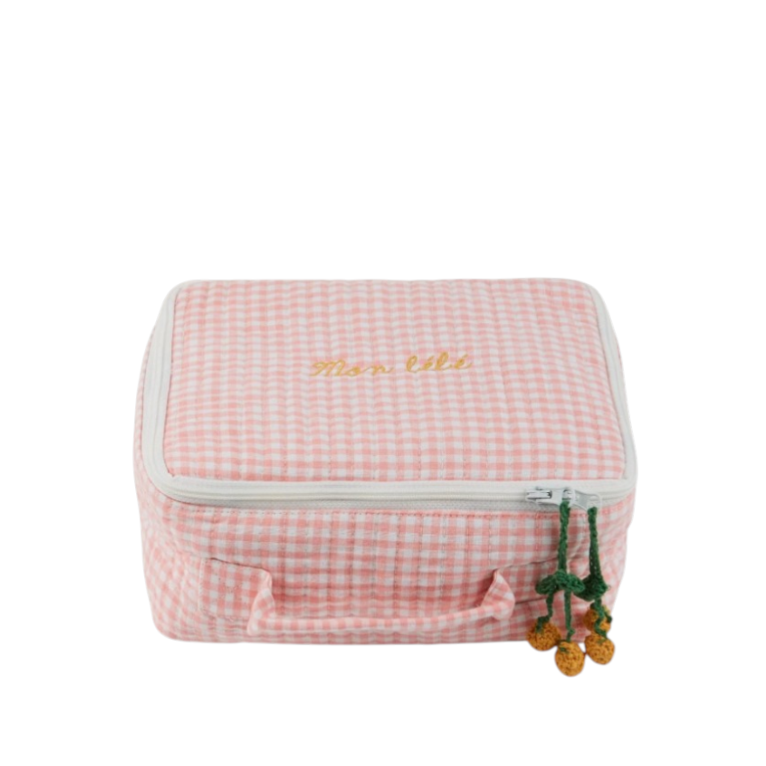 Baby Vanity pink Gingham. Pink and white gingham organic cotton toiletries bag. "Mon Bébé" embroidery brightens up the top of the bag. A lovely baby gift that's perfect for storing baby toiletries. Cotton handle. Quilted and topstitched. Three-sided zip closure with fruit pull tab. Lined with floral cotton. English stitching. Dimensions: 20 x 15 x 8 cm.