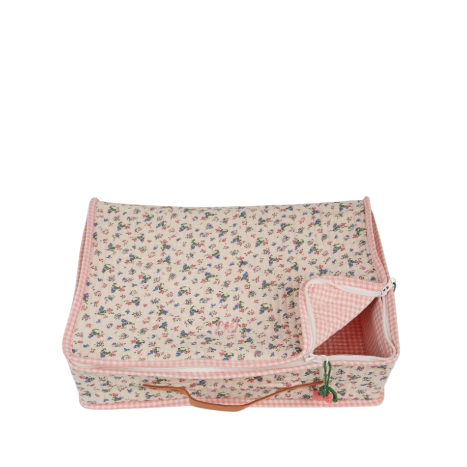 Suitcase Pink with patterns. Large suitcase in pale pink organic cotton with multicoloured country-style patterns. Riveted leather handle. Zip fastening with fruit pull tab. Removable inner frame. Lined in pink and white organic cotton gingham. E&I monogram embroidered on the top. Its featherweight design means you can take it anywhere. Dimensions in cm: 48 x 28 x 10 cm.
