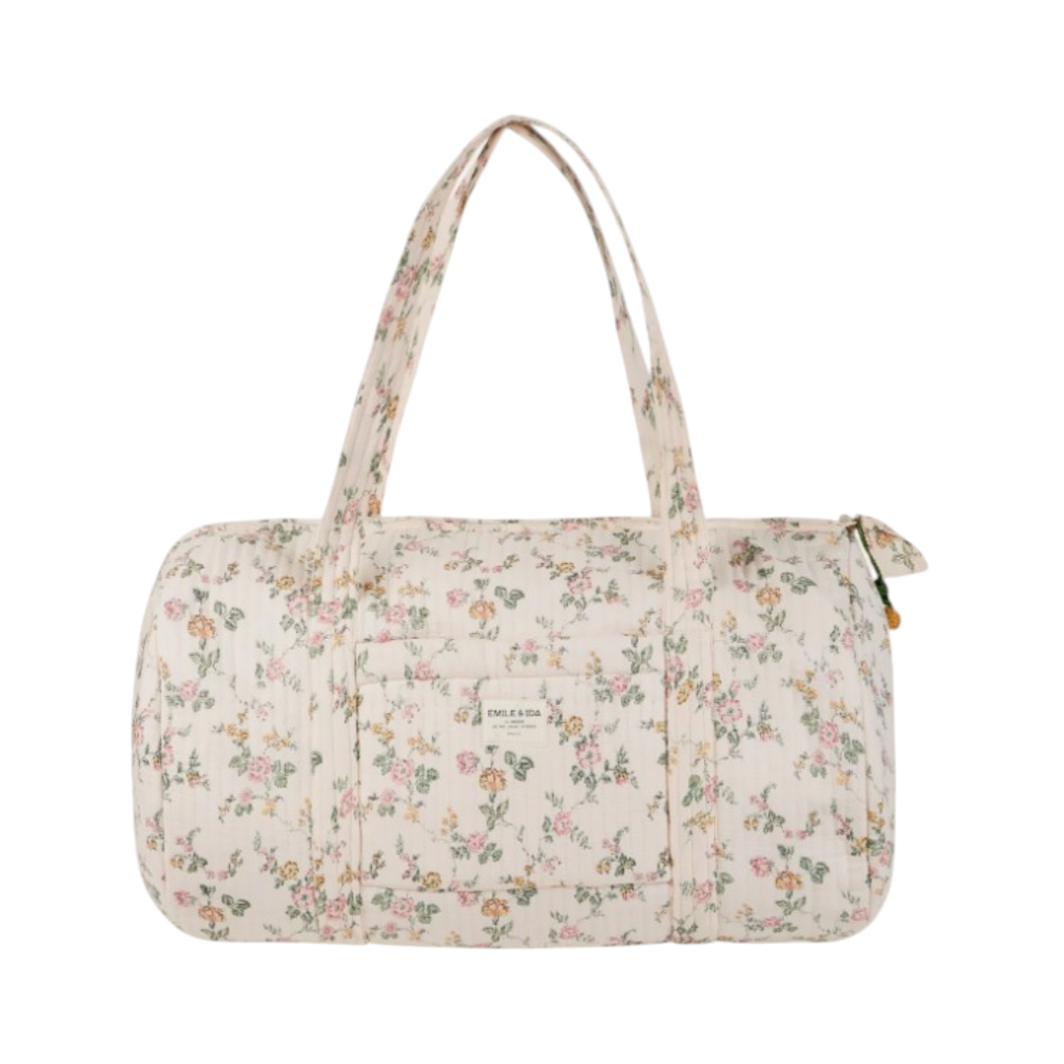 Weekend bag Floral rose. Cream-coloured organic cotton weekend bag with a floral print inspired by vintage fabric. With its large capacity, this bag will be your faithful companion wherever you go. External press stud pocket. Internal pocket. Two handles. Zip fastening. Cotton lininG. Dimensions: 49.5 x 28 x 28 cm.