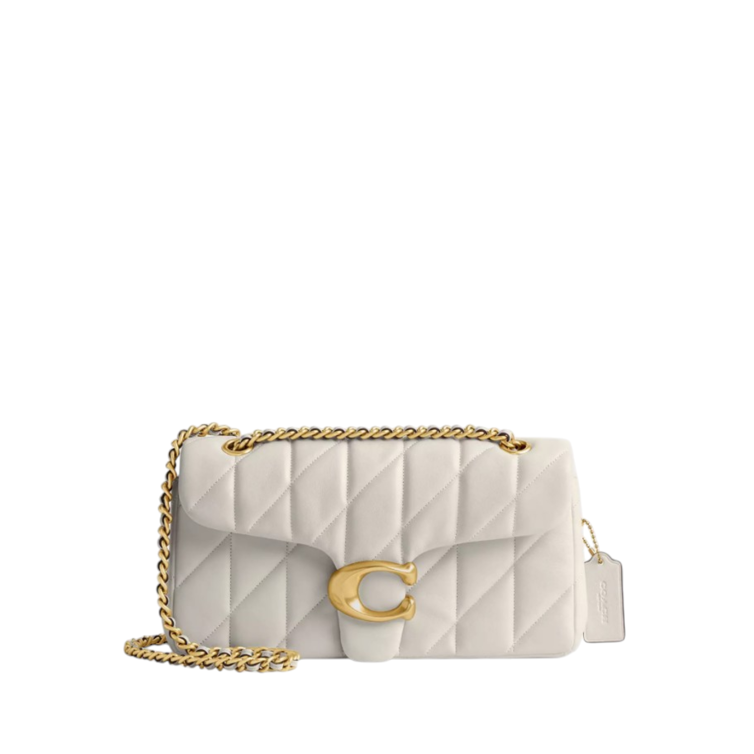 Coach Bag Chalk. A modern take on a 1970s design from the Coach archives, this structured Tabby shoulder bag is crafted from ultra-soft quilted nappa leather. Embellished with a Signature insert in classic Coach style, the compact 26 features a leather chain shoulder strap that can be extended to wear it crossbody or folded down for a more chic shoulder look.