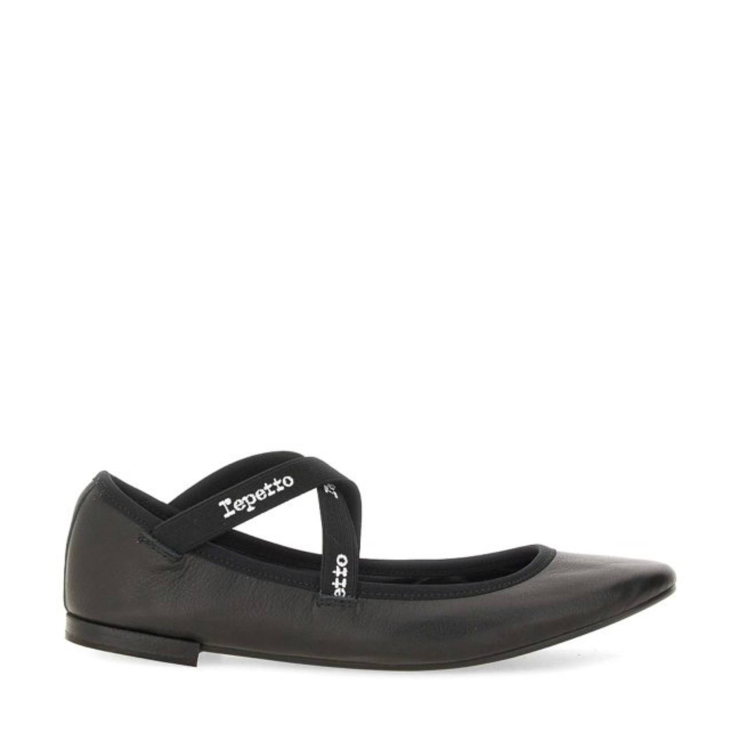 Repetto Black Joana Mary Janes. With its logotype and crossed elastics on the forefoot, the Joana reinvents the ballerina with an urban and contemporary look inspired by the ballet core trend. Made in stitch-and-return, the Joana maintains the emblematic flexibility of the house to dance and walk without restraint.